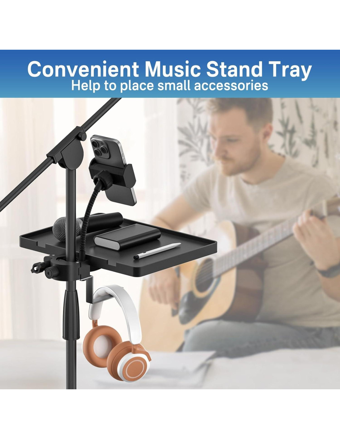 - Mantenga Sus Artículos Seguros: La bandeja para soporte de micrófono mide 6.5 x 8.7 pulgadas (16.5 x 22 cm) con una capacidad máxima de peso de 1.8 kg/4 lbs. Soporta la mayoría de los dispositivos y le permite colocar fácilmente pequeños accesorios en el soporte, como baquetas, picos, pequeños instrumentos de percusión, armónicas, libros, bolígrafos o cualquier artículo pequeño.