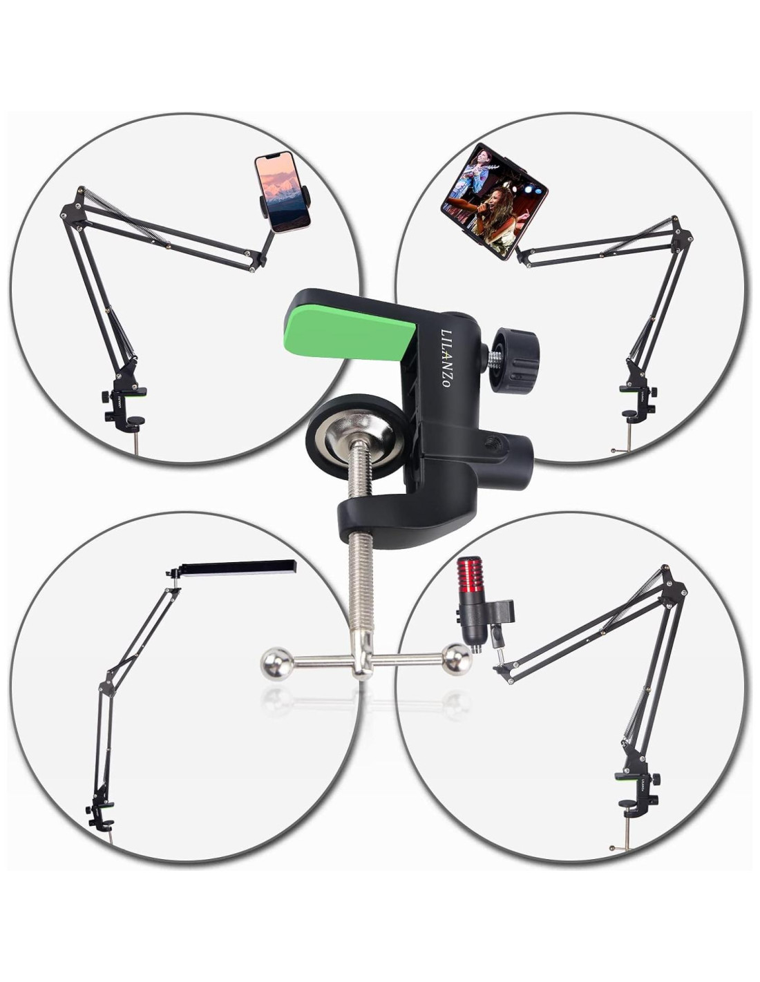 - Base de Aleación de Aluminio LILANZo La abrazadera de montaje en mesa de alta resistencia está hecha de aleación de aluminio, y la base de metal engrosada es muy fuerte y duradera, permitiendo que el soporte del brazo de boom gire 360 a voluntad sin temblar.
