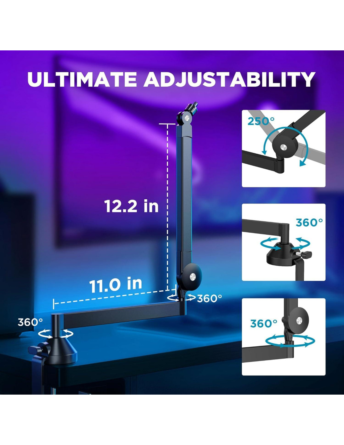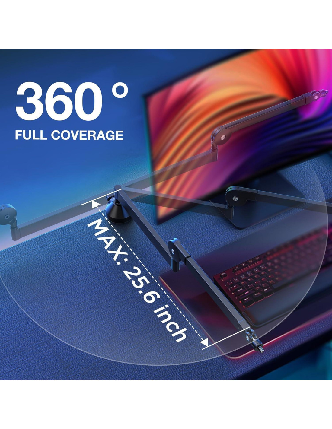 - Ajustabilidad Máxima: Experimenta una flexibilidad inigualable con nuestro brazo de micrófono totalmente ajustable. Extensible hasta 65 cm (25.6 pulgadas), ofrece una cobertura completa para cualquier configuración de grabación o transmisión. Con un rango de ajuste vertical de 250 y una rotación horizontal de 360, tienes la libertad de posicionar tu micrófono exactamente donde lo necesitas para un rendimiento óptimo.