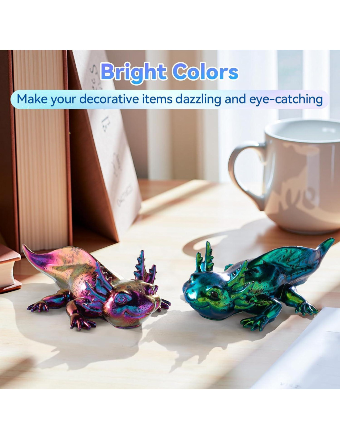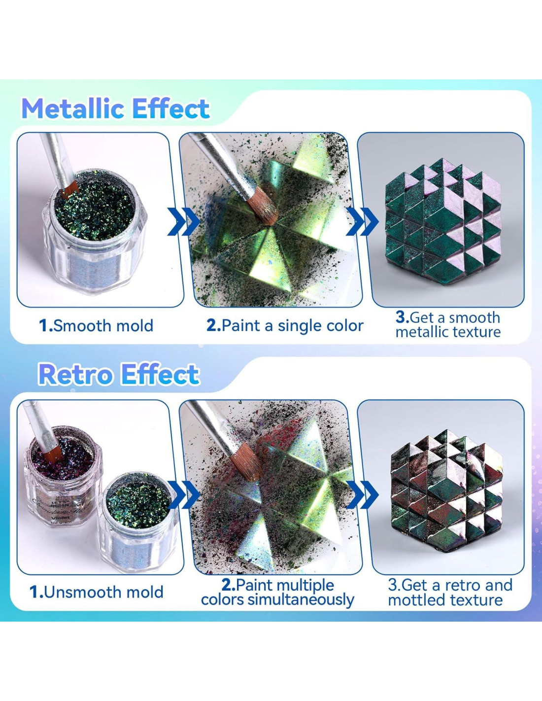 - Escamas de Mica de Cambio de Color Intenso: Hermoso cambio de color brillante, polvo de pigmento de resina altamente saturado que cambia de colores intensos dependiendo del ángulo desde el que se vea. 100% seguro y fácil de lavar.
