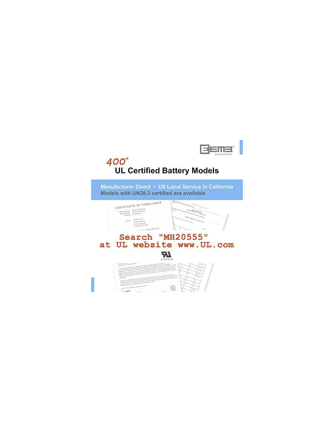 - CERTIFICACIONES-Más de 400 modelos de baterías EEMB están certificados por UL. Busque "MH20555" en UL para toda la información de certificación UL de EEMB.