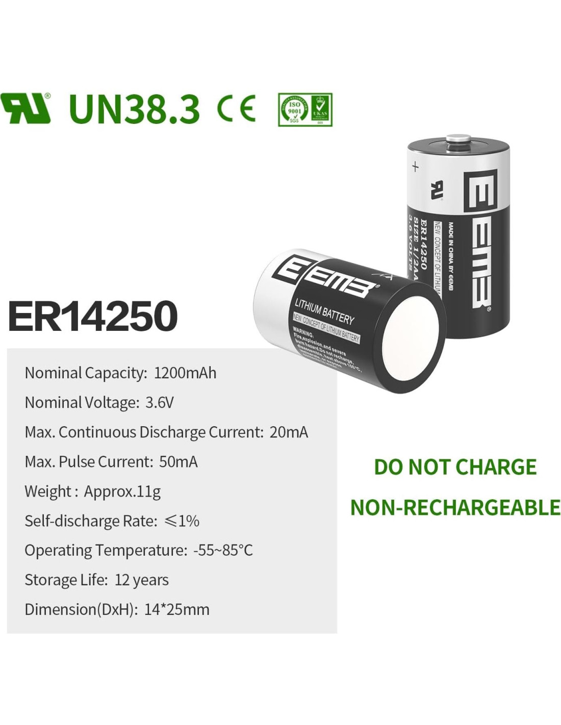 - Información básica - batería de litio de 1/2 AA no recargable de 3.6V; 1200 mAh; 14.5*25mm (0.57*0.98 pulgadas), amplio rango de temperaturas -55C a +85C; más adecuada para dispositivos de bajo consumo.