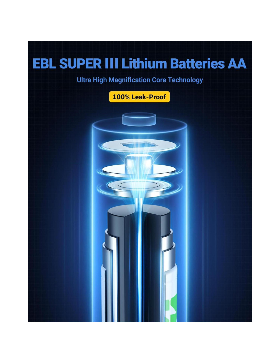 - SUPER 2 & Ultra de Mayor Duración: Las baterías de litio EBL AA 3700mAh son las baterías AA no recargables de mayor duración del mercado, la avanzada TECNOLOGÍA SUPER 2 proporciona un tiempo de uso prolongado, perfecto para dispositivos de alto consumo como cámaras blink, juegos portátiles y gadgets para el hogar inteligente.