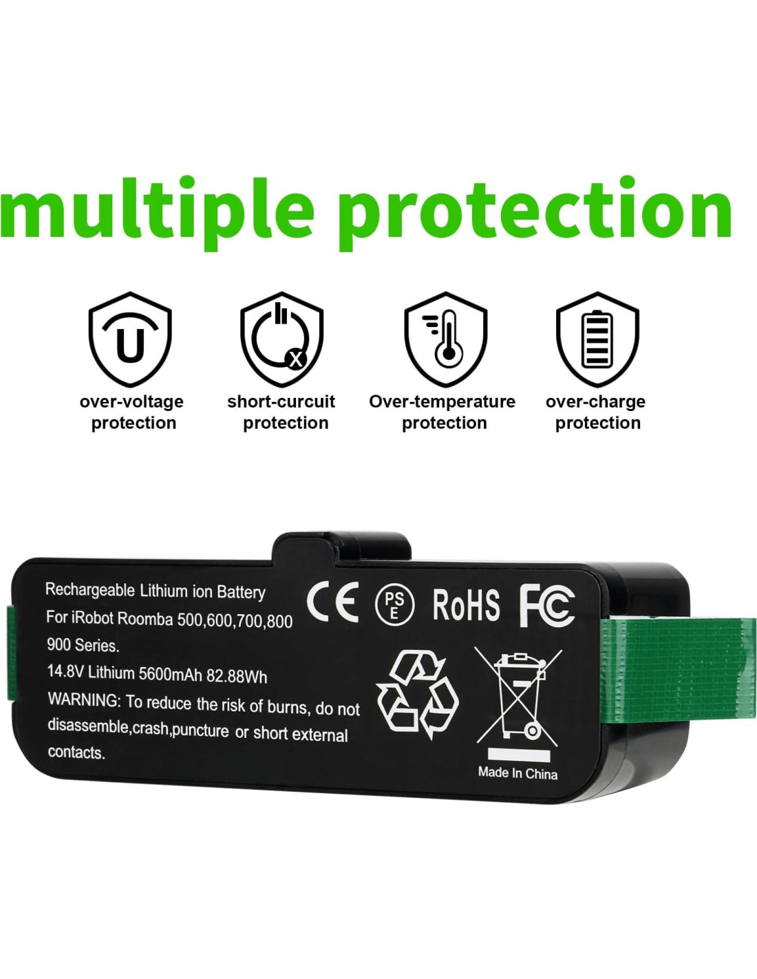 Especificación: Tipo de batería: Li-ion Voltaje: 14.8/14.4V Capacidad: 5600mAh Compatible con la serie Roomba 500 600 700 800 serie Roomba 500: Roomba 500 510 516 520 521 525 530 531 532 533 534 535 536 540 545 550 551 552 555 560 561 562 563 564 565 570 580 581 585 590 595 599 y serie de mascotas Roomba 600 serie: Roomba 600 605 610 620 625 630 631 632 635 645 650 651 653 654 655 660 676 691 694 699 Roomba 700 serie: Roomba 700 760 761 765 767 770 774 775 780 785 790 R3 Roomba 800 serie: Roomba 800 861 864 866 870 871 880 894 (No compatible con Roomba 614, 615, 640, 652, 665, 670, 671, 675, 677, 680, 685, 690, 695, 801, 805, 850, 860, 877, 890, 891 y 895). Precaución: No desensamble No conecte incorrectamente No lo ponga en agua ni use solo el cargador designado para cargar No deseche la batería en fuego ya que puede explotar, la batería también puede explotar si se daña.