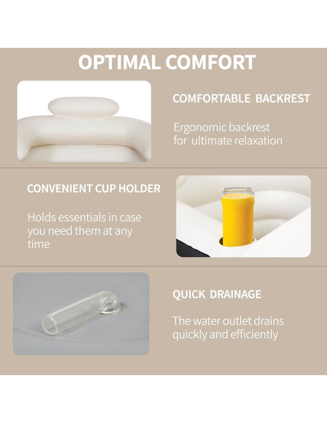 - [Soporte Cómodo, Espacio Amplio] El respaldo y los reposabrazos ergonómicos proporcionan un soporte estable y cómodo para tu espalda, permitiéndote disfrutar de un baño cómodo mientras estás sentado o acostado. El portavasos está diseñado para sostener bebidas, teléfonos celulares y otros artículos que necesites, brindando comodidad a tu experiencia de baño. La bañera de ducha proporciona mucho espacio para adultos, el tamaño desplegado es 73.66*160.02*83.82 cm, asegúrate de tener suficiente espacio para acomodar la bañera inflable antes de comprar.