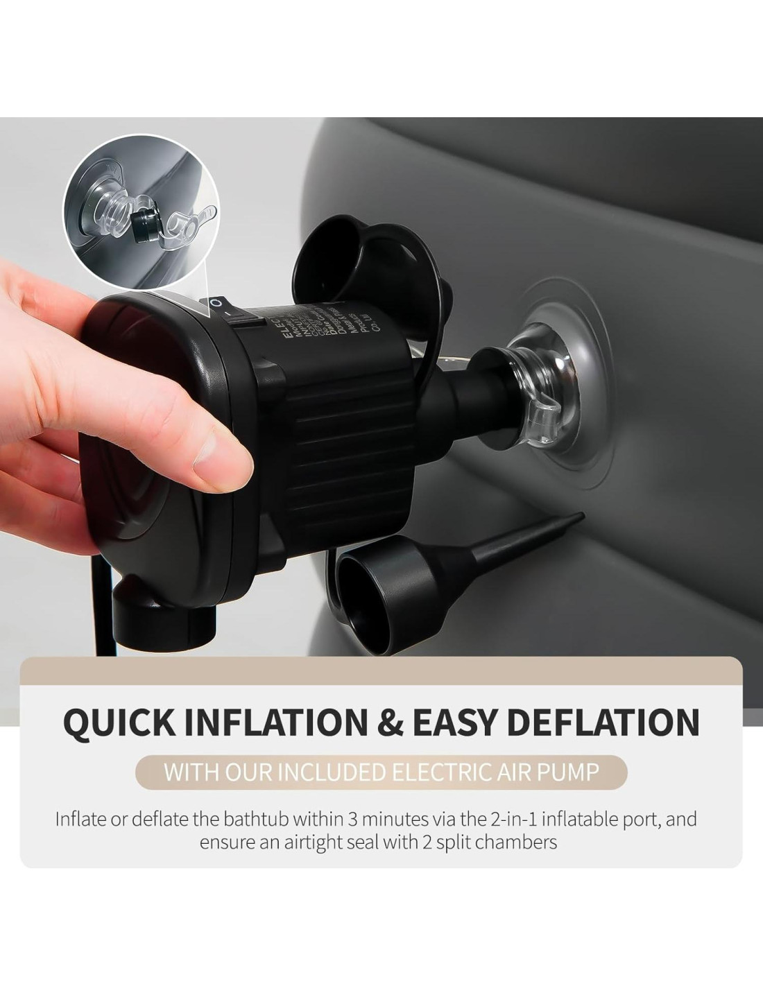 - [Inflado Rápido, Drenaje Suave] La bañera inflable se puede instalar en solo unos minutos gracias a la bomba de aire eléctrica y 2 cámaras de aire separadas. La bomba de aire eléctrica está equipada con 3 tamaños diferentes de boquillas para que puedas inflar/desinflar libremente. El desagüe en la parte inferior drena rápidamente, y también puedes usar el tubo de extensión adicional para ayudar en el drenaje, despídete de los problemas de drenaje y asegura un flujo de agua suave y sin obstrucciones después de usar la bañera inflable.