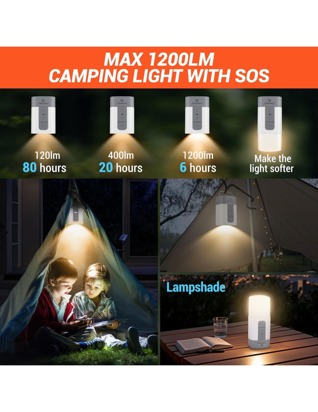 - LUZ DE CAMPING DE 1200 LÚMENES: Cuenta con tres modos, luz suave de 120 lúmenes, luz de lectura de 400 lúmenes y luz exterior de 1200 lúmenes, y la pantalla de lámpara hace que la luz sea más suave