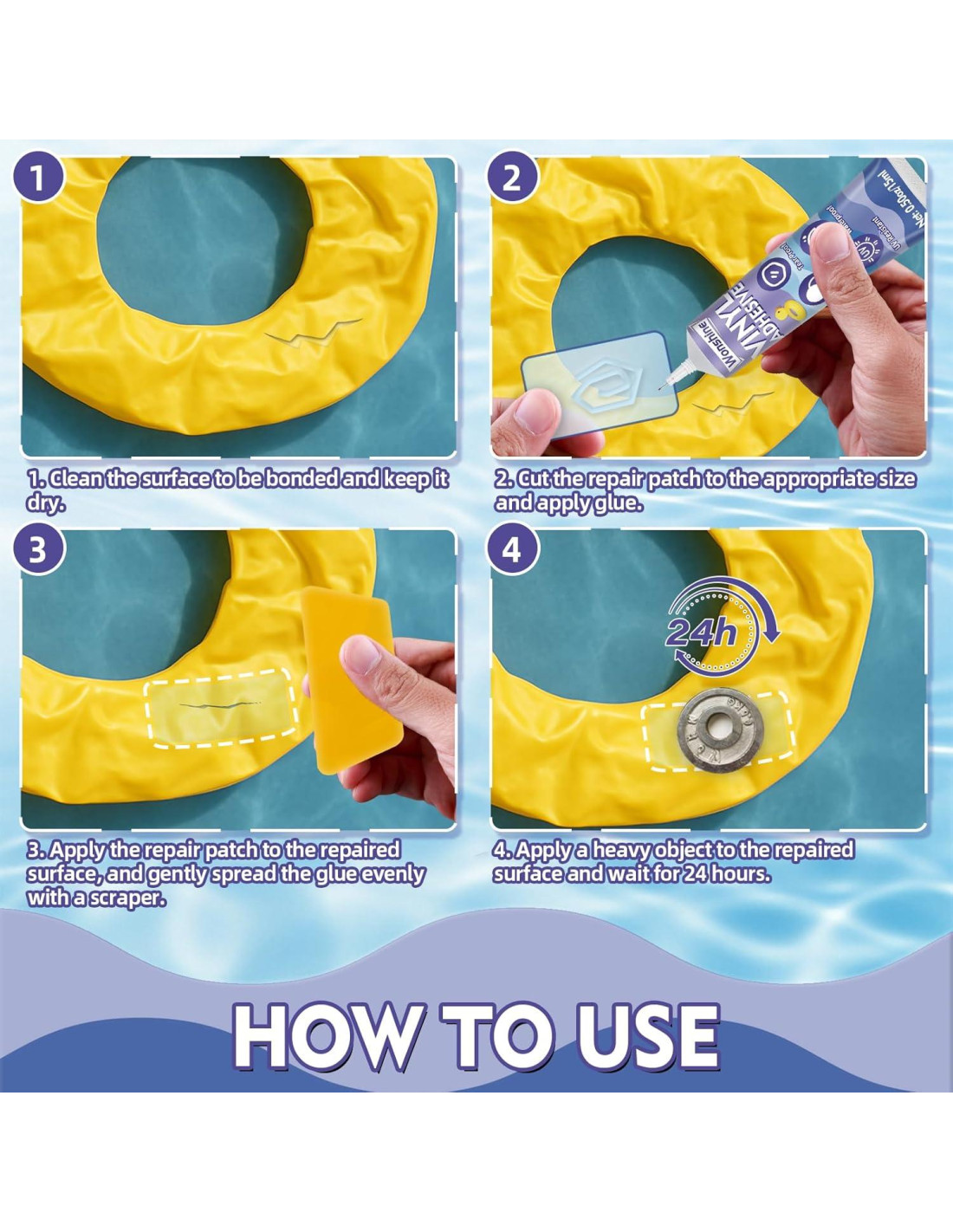 - Amplia Aplicabilidad: El kit de reparación de piscina se utiliza principalmente para PVC, EVA, ABS, goma y otros materiales autoadhesivos, adhesivos mutuos. Puede arreglar cualquier rasguño o fuga en cualquier superficie de cloruro de polivinilo: camas de aire o trampolines; piscinas inflables o spas, barcos o kayaks y más.