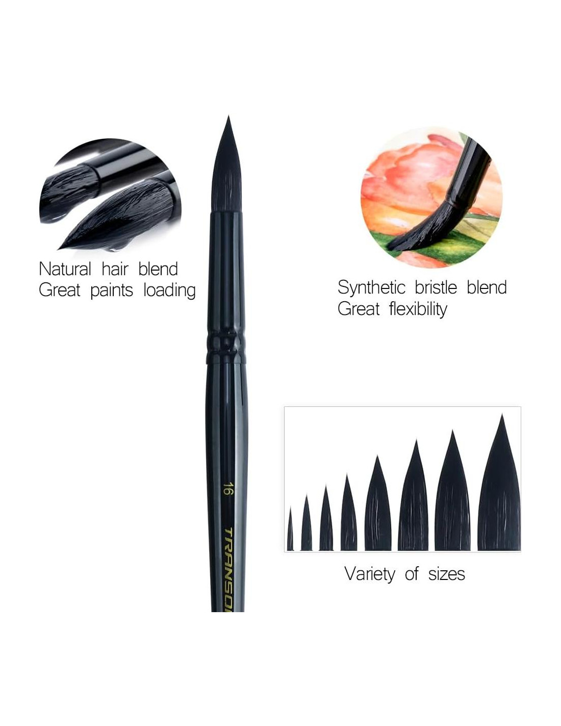 - Los pinceles redondos de acuarela Transon son versátiles. Realizan tanto detalles finos (con la punta) como lavados medianos. Estos pinceles redondos también son adecuados para acrílicos, tintas, gouache, etc.