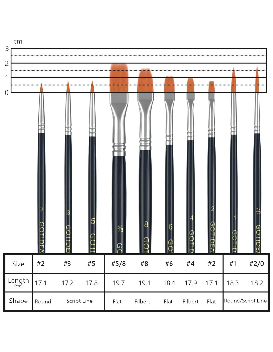 - Juego de Pinceles GOTIDEAL: 1 Paquete 10 Tamaños Diferentes, pinceles de punta redonda con una variedad de formas hacen que MEZCLAR COLOR sea más fácil, el juego de pinceles de mango de madera de alta calidad es perfecto para artistas, aficionados, estudiantes, adolescentes, niños, y pintores de todos los niveles, 10 Tamaños: 5/8 8 6 4 5 3 2 2 1 2/0; Longitud: 17.1 cm a 19.7 cm (6.7 a 7.7 pulgadas).