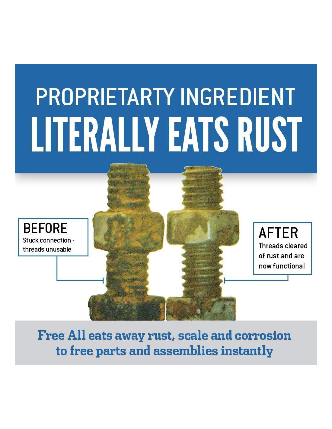 - Penetración Avanzada de Óxido: Nuestra fórmula de vanguardia busca y disuelve el óxido a nivel molecular, comiendo la corrosión que une las partes. Free All funciona en una amplia gama de aplicaciones, desde conexiones de tuberías oxidadas hasta tornillos de máquina y juntas universales.