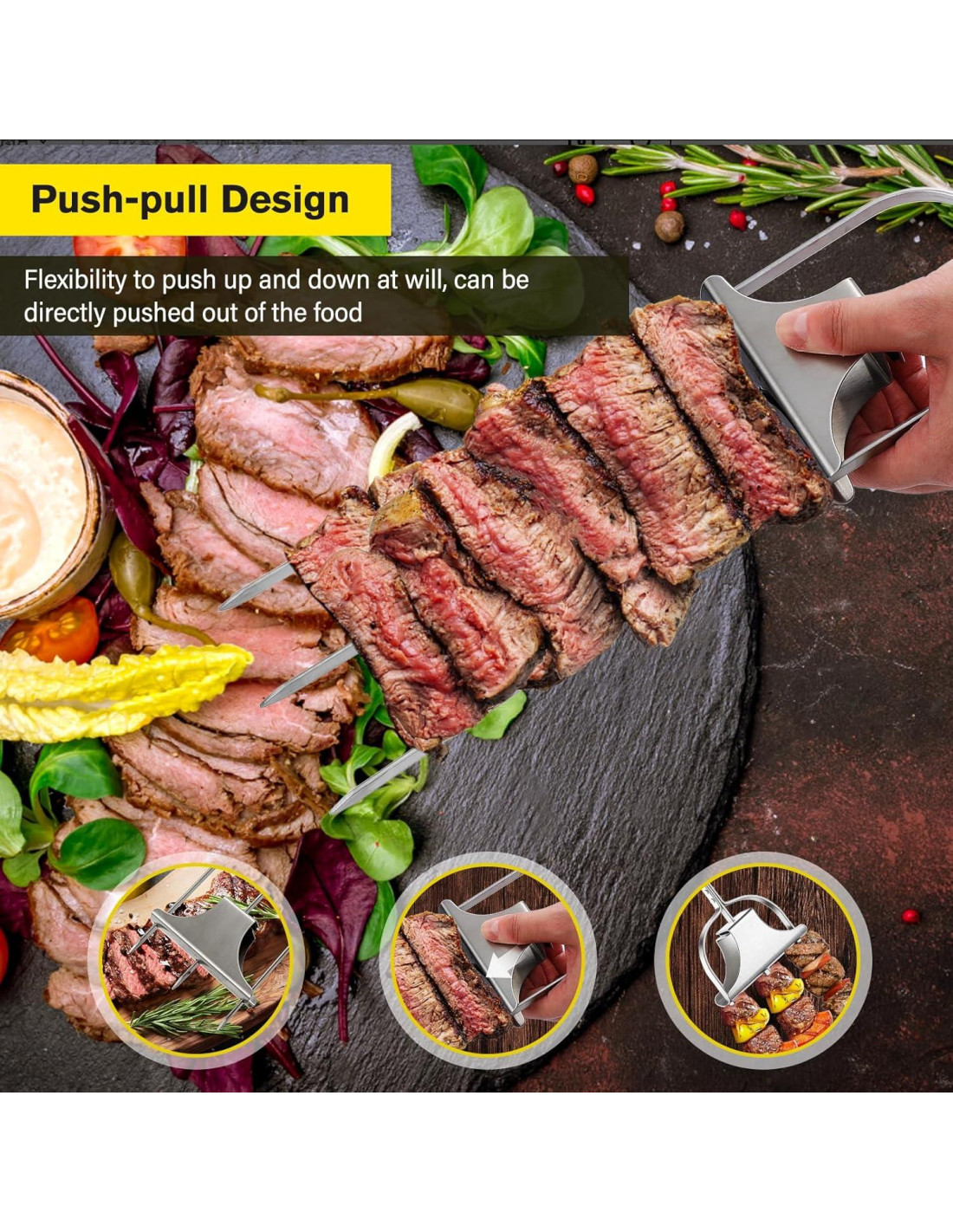 - Diseño Considerado: Los palos de pincho están diseñados con una combinación de un deslizador de empuje y un mosquetón, lo que te ayuda a quitar fácilmente la comida del pincho y también evita que el deslizador se caiga cuando no está en uso. Las 3 puntas están diseñadas para asar más comida al mismo tiempo para que se calienten de manera más uniforme, y la parte superior está diseñada con un anillo rectangular para un agarre cómodo, y se puede colgar para almacenamiento cuando no está en uso.