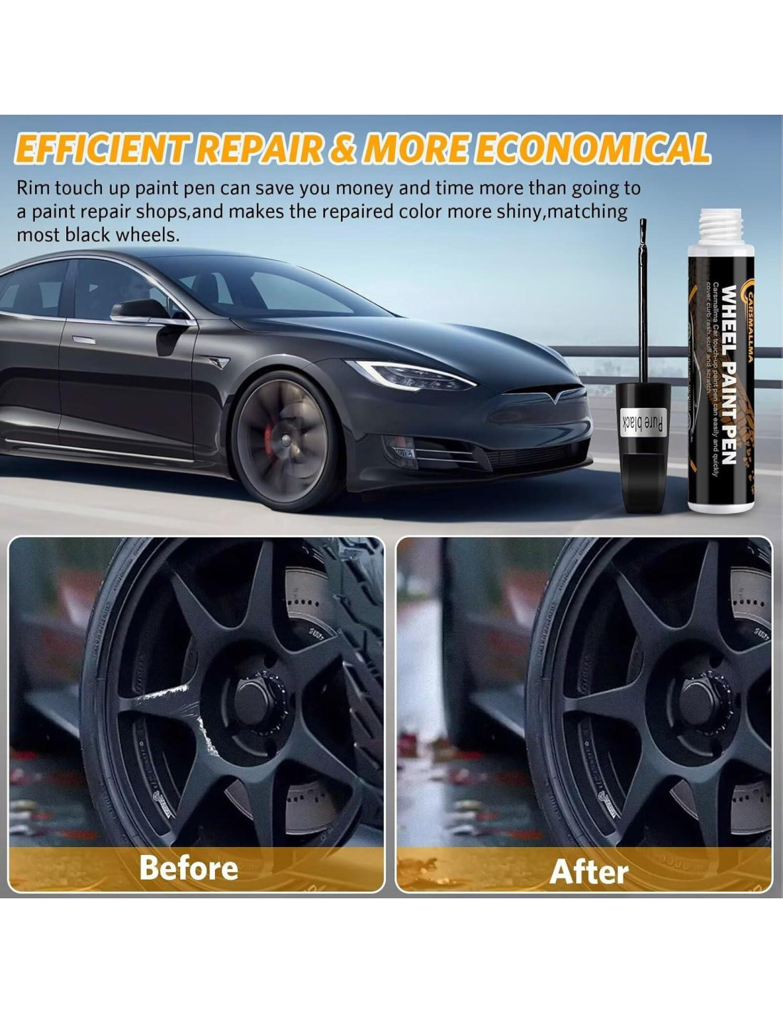 Pintura de retoque para llantas, pintura de llantas Carsmallma para reparación de rayones en llantas, kit de bolígrafo removedor 2 en 1, pintura de retoque negra para coches, solución rápida y fácil para rayones de bordillo (Negro)