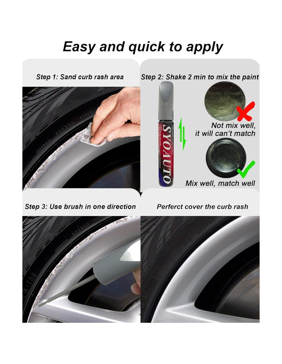 - El manejo diario recibe chips de roca y rasguños: Los neumáticos desinflados, el daño en las llantas y el daño en el bordillo inevitablemente ocurrirán y causarán muchos rasguños. Preferirás la pintura de retoque para llantas plateadas SYOAUTO para evitar el daño en tus llantas de aleación