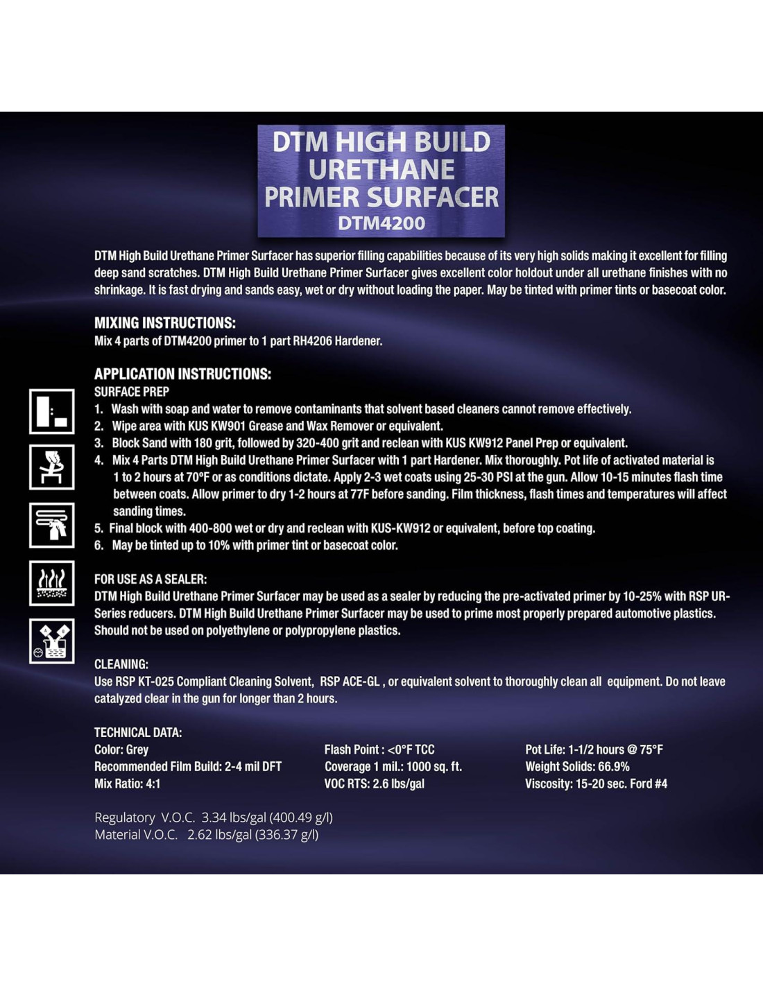 - Esta imprimación DTM4200 directa al metal proporciona una excelente retención de color bajo todos los acabados de poliuretano sin contracción. Se seca rápidamente y se lija fácilmente en húmedo o seco sin cargar el papel. Se puede teñir con tintes para imprimación o toners de capa base.