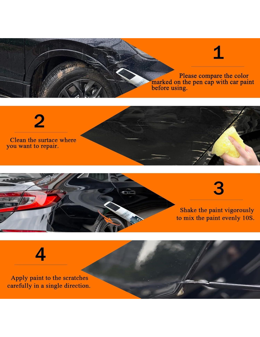 - Consejos de aplicación. Esta pintura es fácil de usar. Simplemente limpie la superficie y elimine la grasa, y agite durante aproximadamente 1 minuto para mezclar bien la pintura. El kit de reparación de pintura es adecuado para pequeñas astillas o abolladuras más grandes. Se secará en 10 minutos. Antes de usar, pruébelo en papel para confirmar que el color coincide con la pintura de su vehículo.