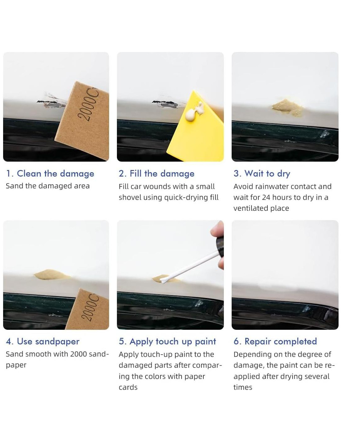 - [Duradera] : Este kit de reparación de arañazos de pintura para automóviles ofrece resultados duraderos, tiene una fuerte adhesión, es a prueba de óxido y resistente al agua, y se puede usar repetidamente. Protegiendo la superficie de tu automóvil de daños adicionales y manteniendo su brillo y apariencia. Te ahorra mucho tiempo, haciéndolo una opción perfecta para retoques rápidos.
