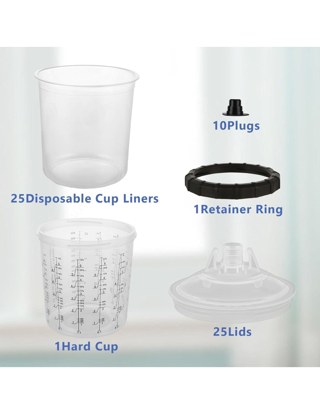 - [Fácil de Usar] Paquete de 25 kit de taza de pistola de 22 onzas (650 ml). El kit incluye 25 forros de taza con una capacidad de fluido de 22 onzas (650 ml), 25 tapas con filtros de fluido de 125 micrones incorporados, 1 taza dura con anillo de retención y 10 tapones de sellado de taza. Las tazas de pintura automotriz tienen solo tres partes para una fácil instalación. Compatibilidad del adaptador: nuestra taza dura tiene graduaciones claras para determinar las proporciones de mezcla para sistemas de pintura comunes y es transparente para ver fácilmente el nivel del líquido.