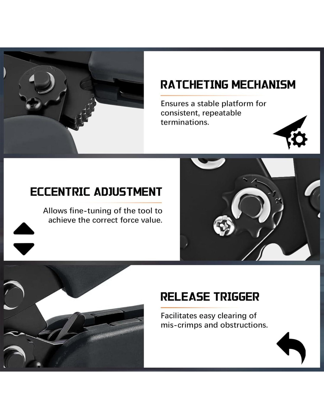 - Cuenta con un mecanismo de palanca con fuerza de crimpado ajustable y un gatillo de liberación rápida para un crimpado suave y eficiente.