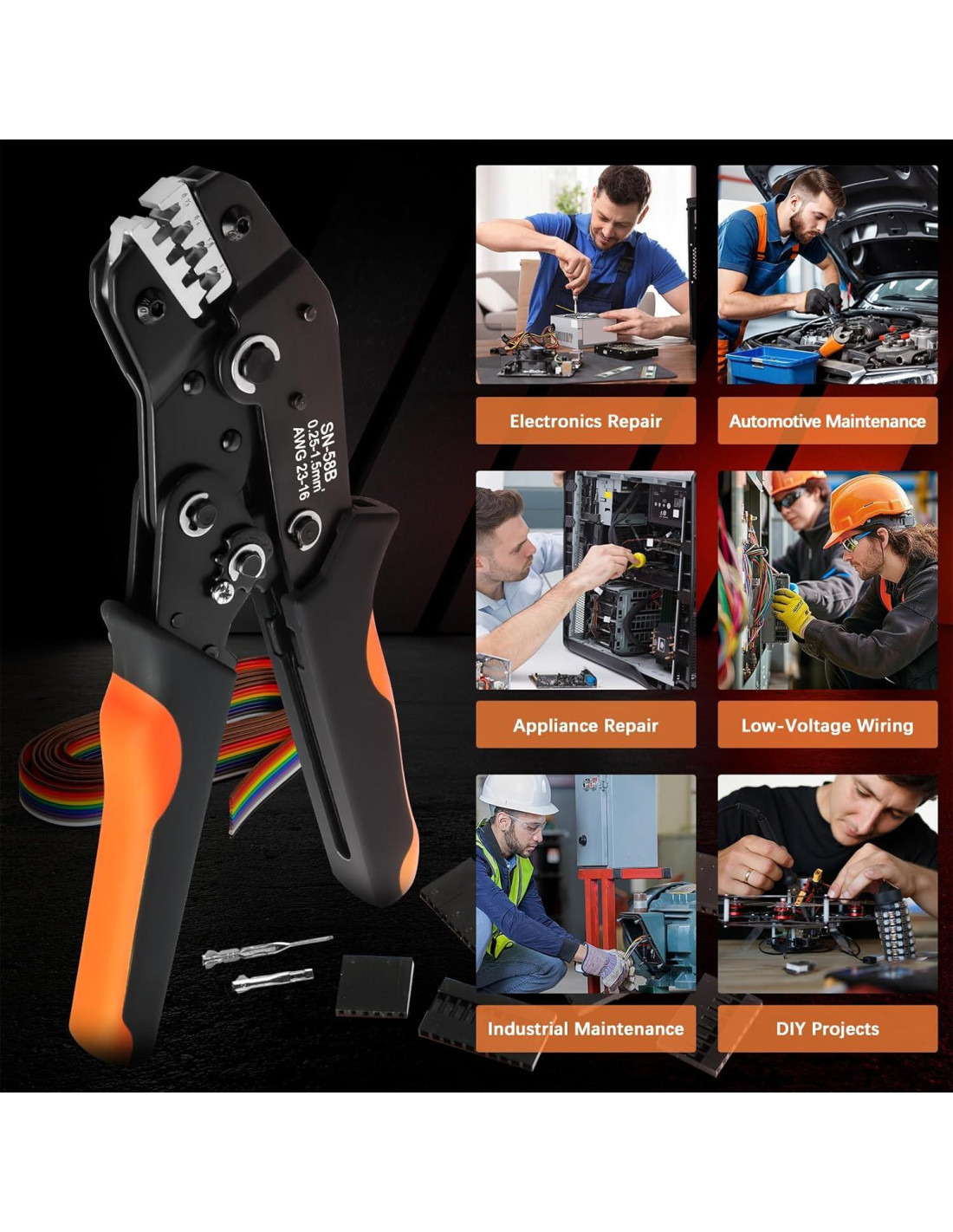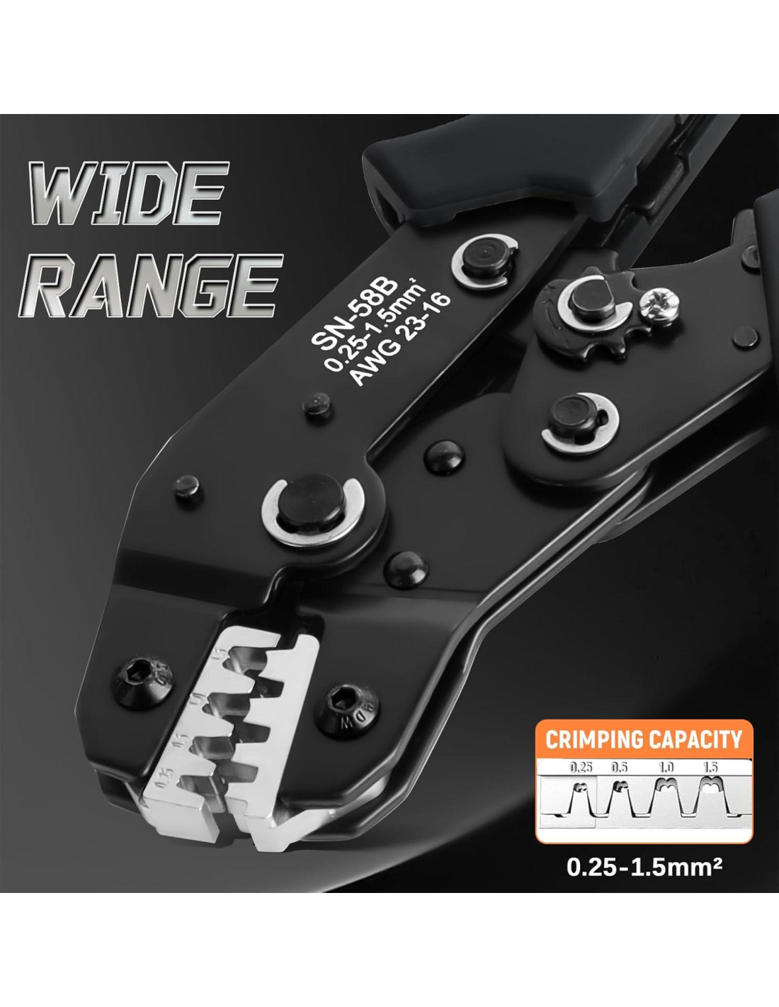 - La herramienta de crimpado SN-58B soporta tamaños de cable de AWG 23-16 (0.25-1.5mm) y es compatible con terminales de barril abierto para marcas como JST, Dupont, Molex, Amon y Amphenol con espaciado de pines de 2.5mm, 2.54mm, 2.8mm, 3.96mm, 4.8mm y 6.3mm.