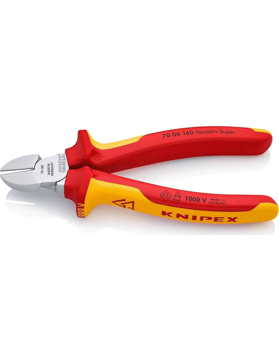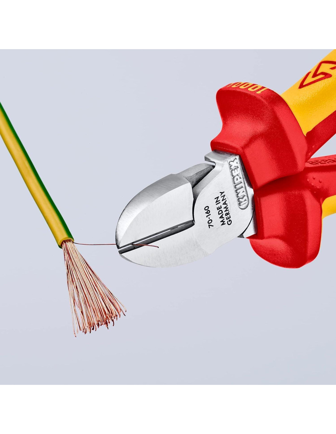 Descripción del producto 70 06 160 Cortador Diagonal El cortador diagonal indispensable para uso general. Material de alta calidad y mano de obra precisa para una larga vida útil. Bordes de corte de precisión para alambre blando y duro. Corte limpio de alambres de cobre delgados, también en las puntas de los bordes de corte. Bordes de corte adicionalmente endurecidos por inducción, dureza del borde de corte aproximadamente 62 HRC. Estilo de cabeza estrecha para uso en áreas confinadas. Seguridad probada por VDE hasta 1000 voltios. con borde de corte alargado. con bisel. Capacidades de corte alambre blando (diámetro): 4.0 mm Capacidades de corte alambre medio duro (diámetro): 3.0 mm Capacidades de corte alambre duro (diámetro): 2 mm Probado por VDE: sí El set contiene: 70 06 160 Cortador Diagonal