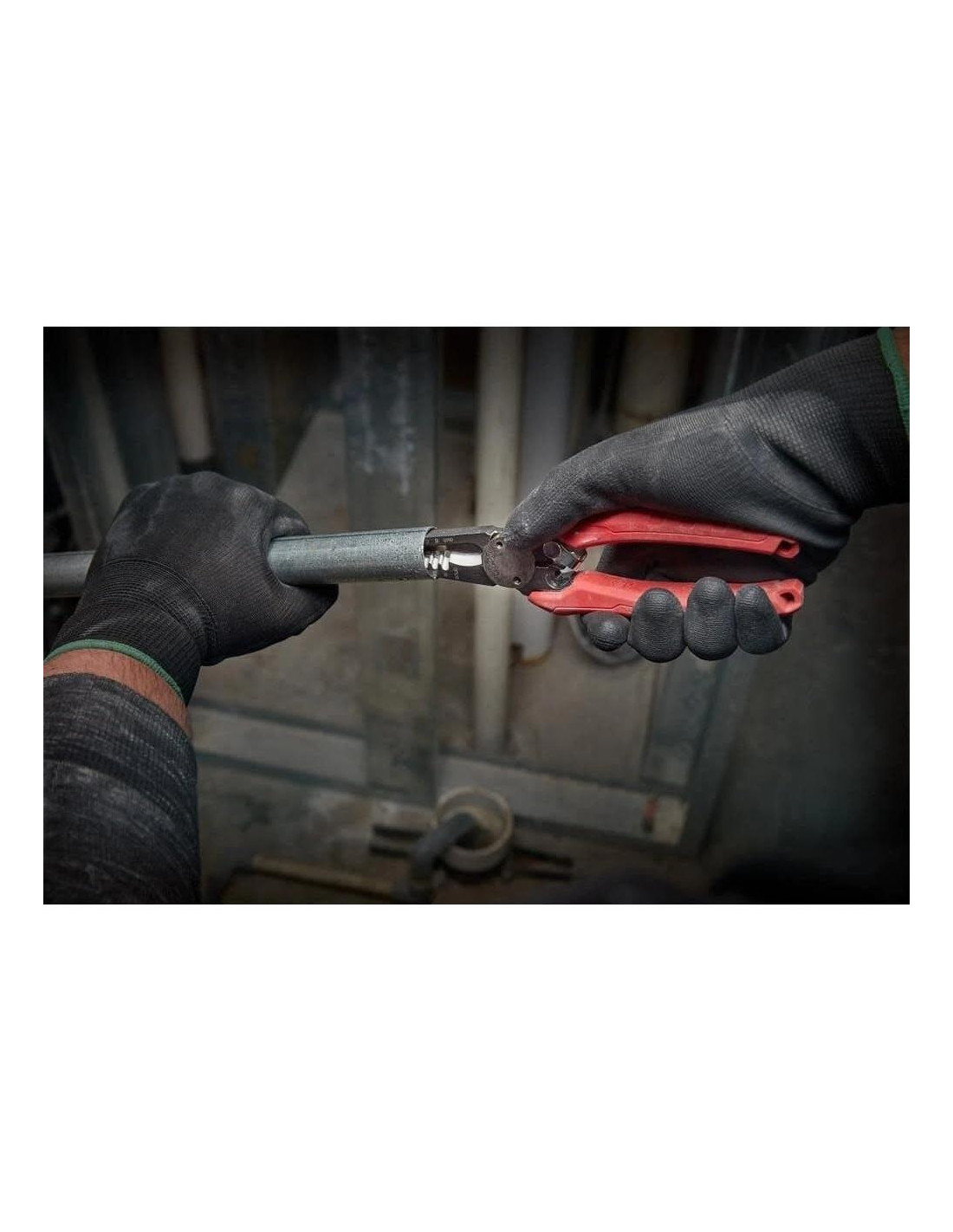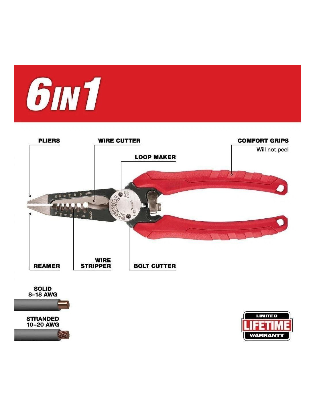 Los Alicates de Combinación 6 en 1 cuentan con un diseño revolucionario de doble cabeza forjada para desforrar cables y funcionalidad de punta de aguja. Un diseño único de reaming está integrado en la cabeza de los alicates para suavizar los bordes ásperos de las tuberías de metal, y un diseño de hoja curva permite cortes limpios a través de tamaños de cable más grandes. Estos alicates tienen la capacidad de cortar pernos #6 y #8 y cuentan con un diseño de bloqueo oscilante para una operación rápida con una mano, y no se abrirán cuando se almacenen en una bolsa o mochila.