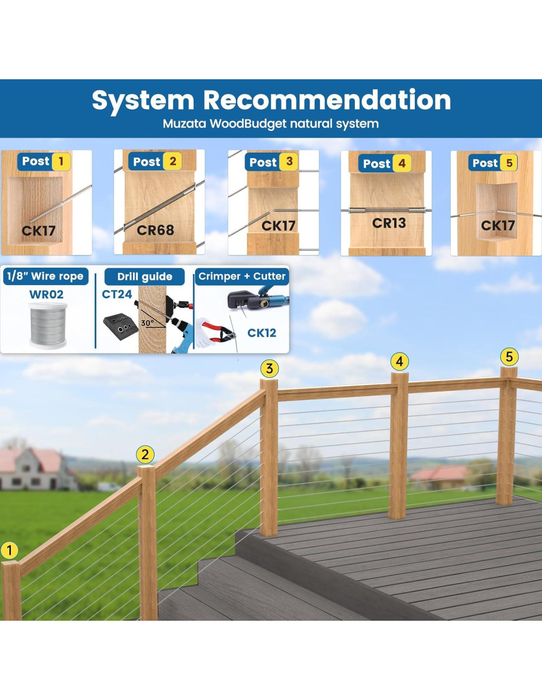 - [Consejos para construir un sistema] Para ayudarle a construir el sistema de barandilla de cable negro MetalEasy de manera más eficiente, recomendamos las siguientes combinaciones de productos de Muzata, incluidos los kits de barandilla de cable CR23 CR07, cable de acero WR22, funda protectora CR79 CR90, arandela adhesiva CR91, arandela en ángulo CR25, cortador de cable y crimpadora hidráulica CK12, postes PS01-BA4S PS02-BH4S B34S, barandillas HT10-BP4, conectores de barandilla HA01 HA02 HA23