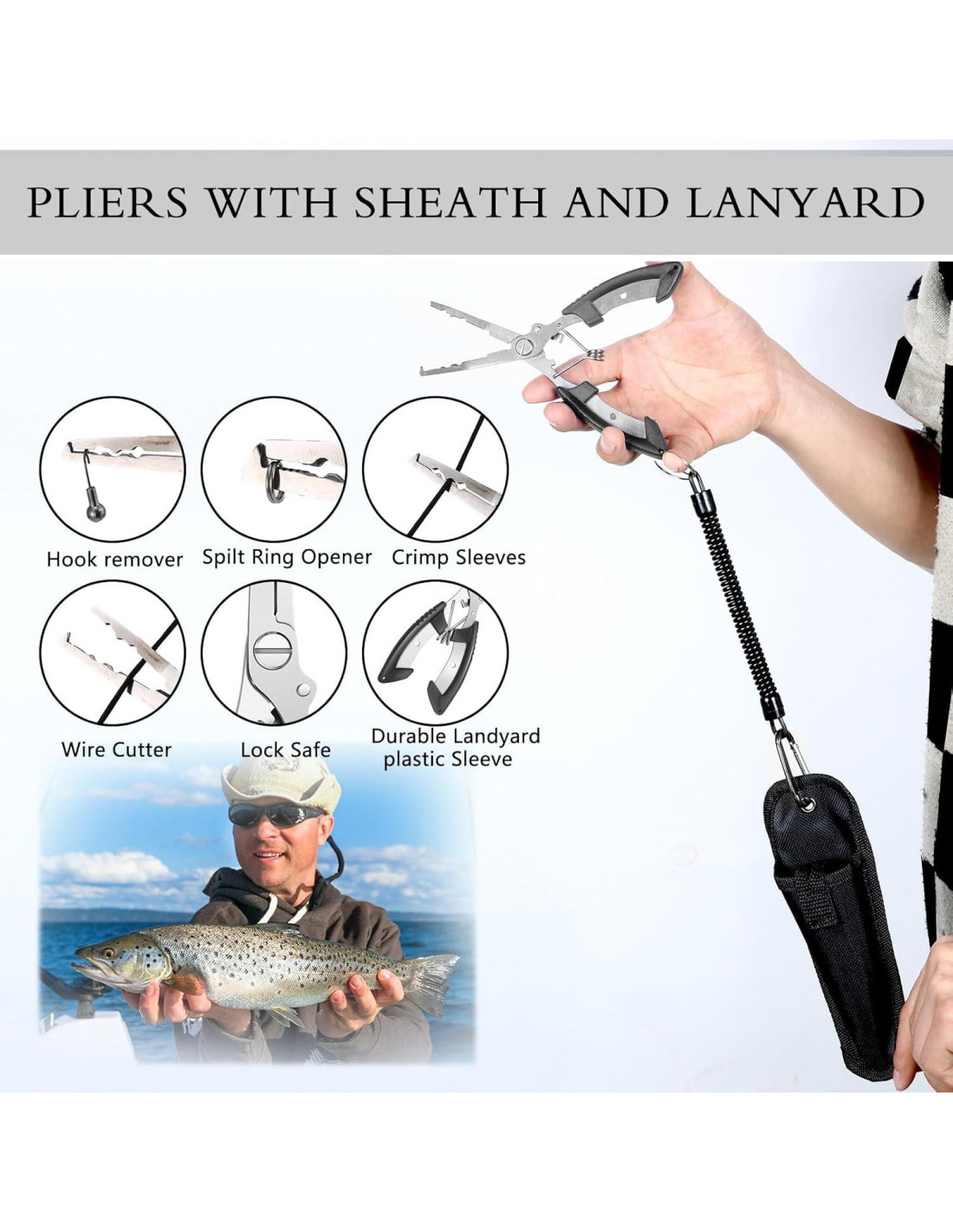 - Práctica Pinza de Pesca: puedes colgar la cuerda de herramientas de pesca y las pinzas para anzuelos juntas para evitar que las pinzas se deslicen; La pinza tiene un amplio rango de uso; Se puede aplicar para sacar anzuelos, cortar líneas de pesca y alambres de acero, y atar líneas de pesca; Equipado con un resorte de alta recuperación, para hacer la operación que ahorra esfuerzo