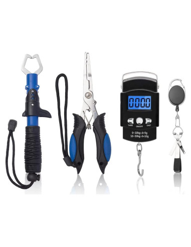 - [Regalos de Pesca para Pescadores] El juego de herramientas de pesca de 4 piezas incluye 1 x alicates de pesca, 1 x agarrador de labios de pescado, 1 x balanza digital de pesca, 1 x herramienta para atar nudos de pesca. Regalos ideales para amigos o familiares pescadores, como el Día del Padre, el Día de San Valentín y la Navidad.