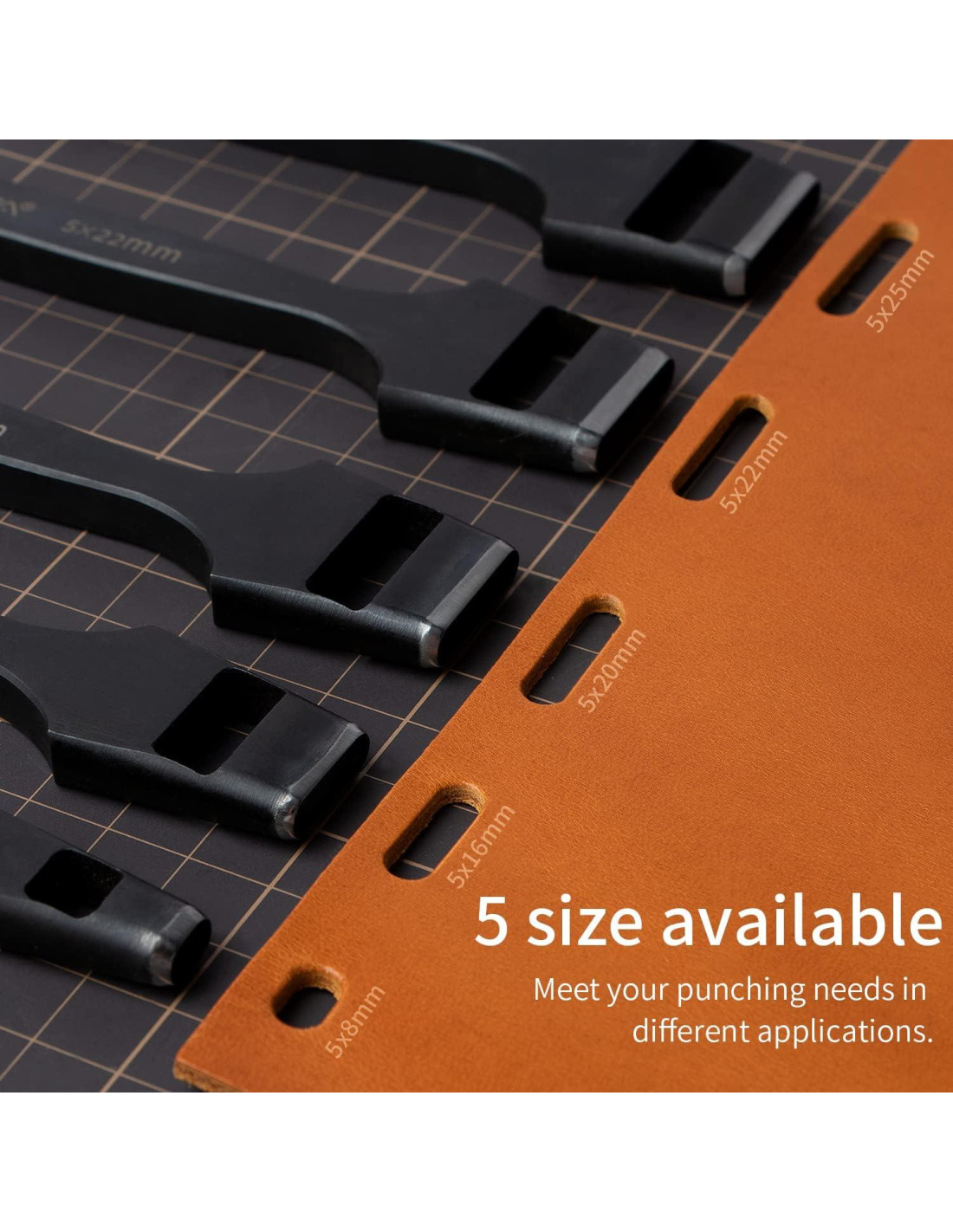 - 5*8mm/5*16mm/5*20mm/5*22mm/5*25mm, un total de 5 tamaños disponibles, se puede usar para hacer formas ovaladas limpias en cuero, cinturones, correas, juntas, ropa, goma y otros materiales suaves.