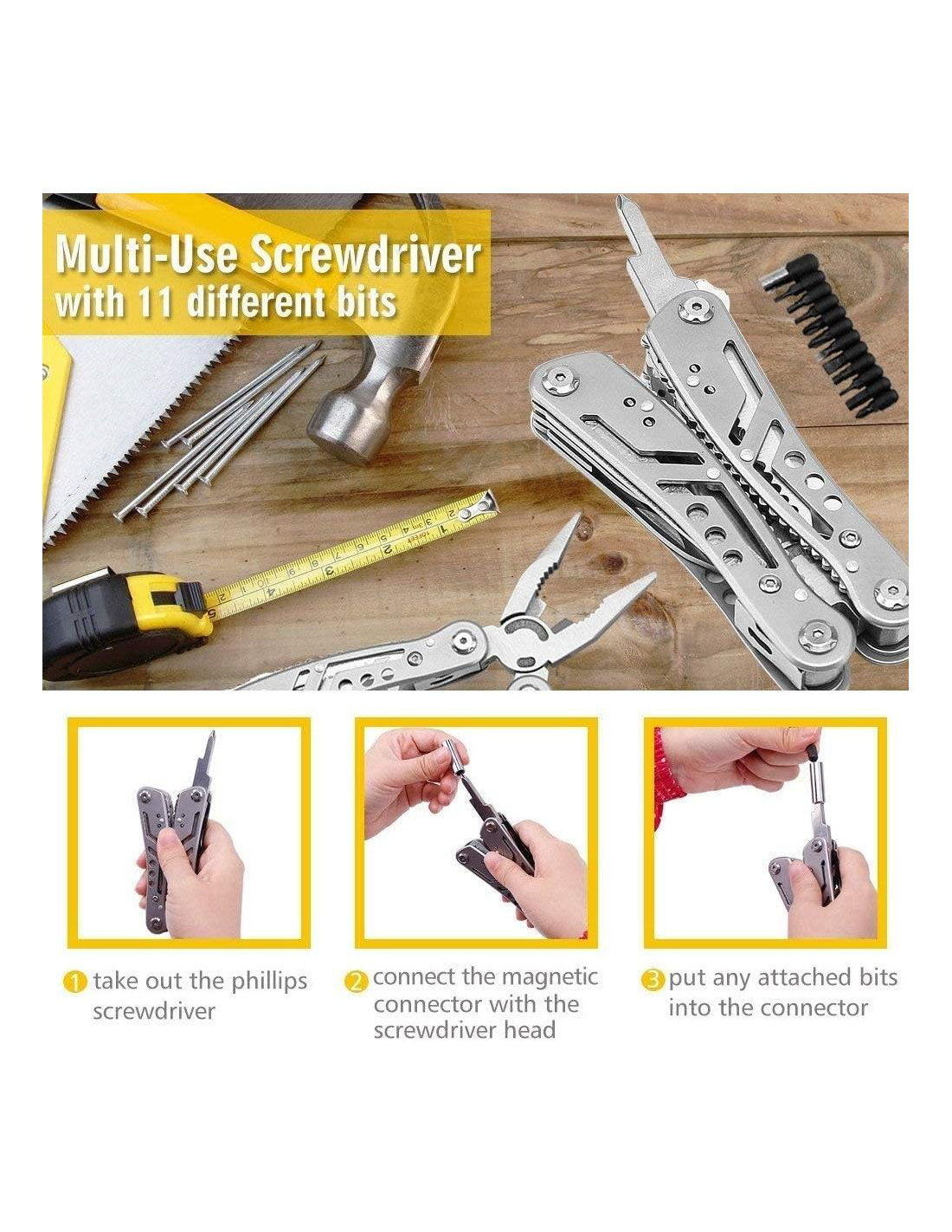 - Componentes incluidos: Funda, Alicate Multiherramienta, Puntas de Destornillador
