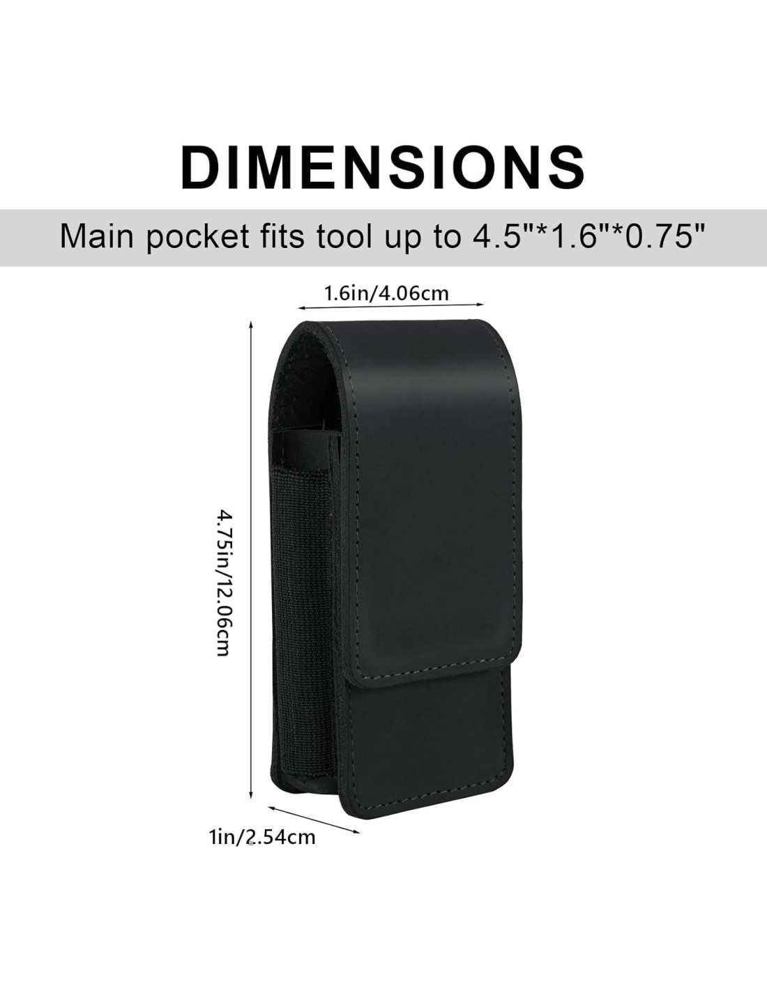 - Funda de Multiherramienta de Cuero. Dimensiones internas del bolsillo de cuero EDC: 12.07 cm x 4.06 cm x 2.54 cm. Diseñada con un tamaño grande, el bolsillo principal acomoda multiherramientas de hasta 11.43 cm de largo y 4.06 cm de ancho, con un compartimento interior separado. La banda elástica abierta en ambos lados puede ajustarse a un equipo EDC delgado con clip de bolsillo, mejorando la prevención de pérdida de herramientas.