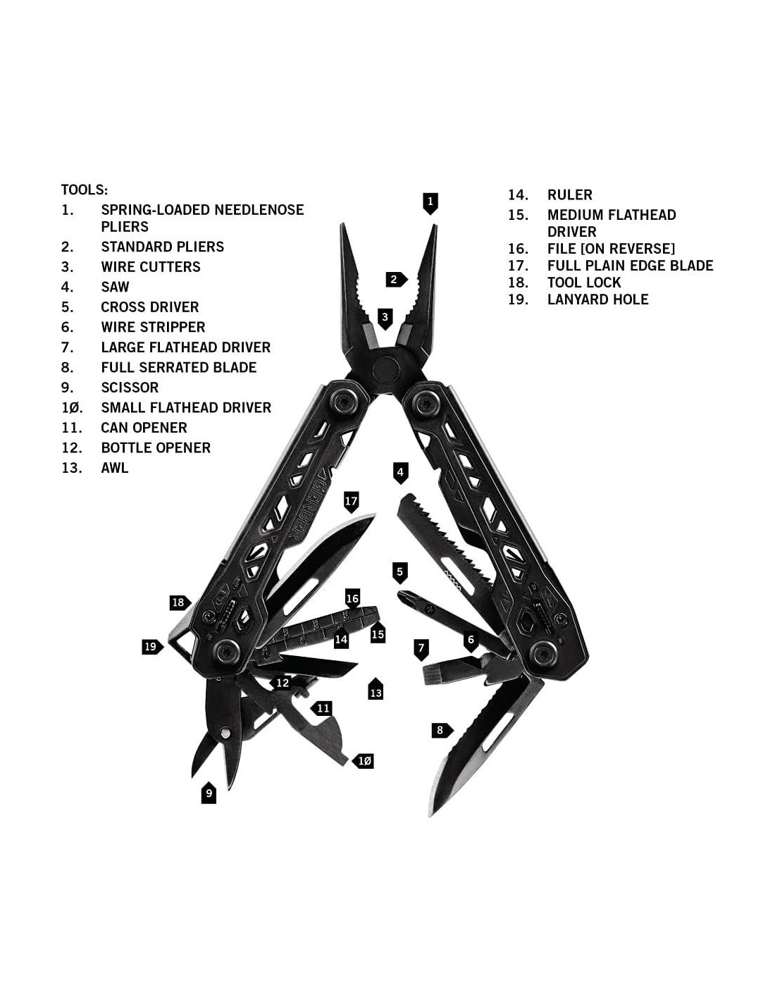 - MULTIHERRAMIENTA 17-EN-1: Cuenta con alicates de punta de aguja, alicates estándar, cortadores de alambre, sierra, destornillador cruzado, pelacables, hoja completamente serrada, tijeras, destornillador de cabeza plana pequeño, mediano y grande, abrelatas, abridor de botellas, punzón, regla, lima, hoja de borde recto completa