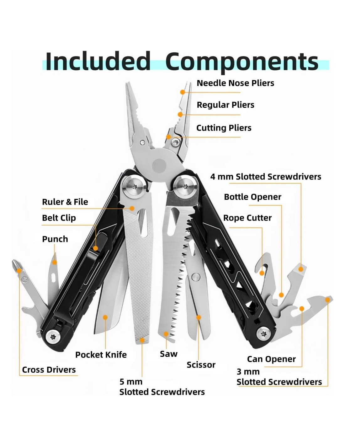 - 17-en-1 Multiherramienta La pinza multifuncional incluye alicates de punta, alicates regulares, alicates de corte, 3 * destornilladores ranurados (3,4,5mm), destornilladores de cruz, abrelatas, abrebotellas, cortador de cuerda, cuchillo de bolsillo, sierra, tijeras, regla y lima, perforador, clip para cinturón.