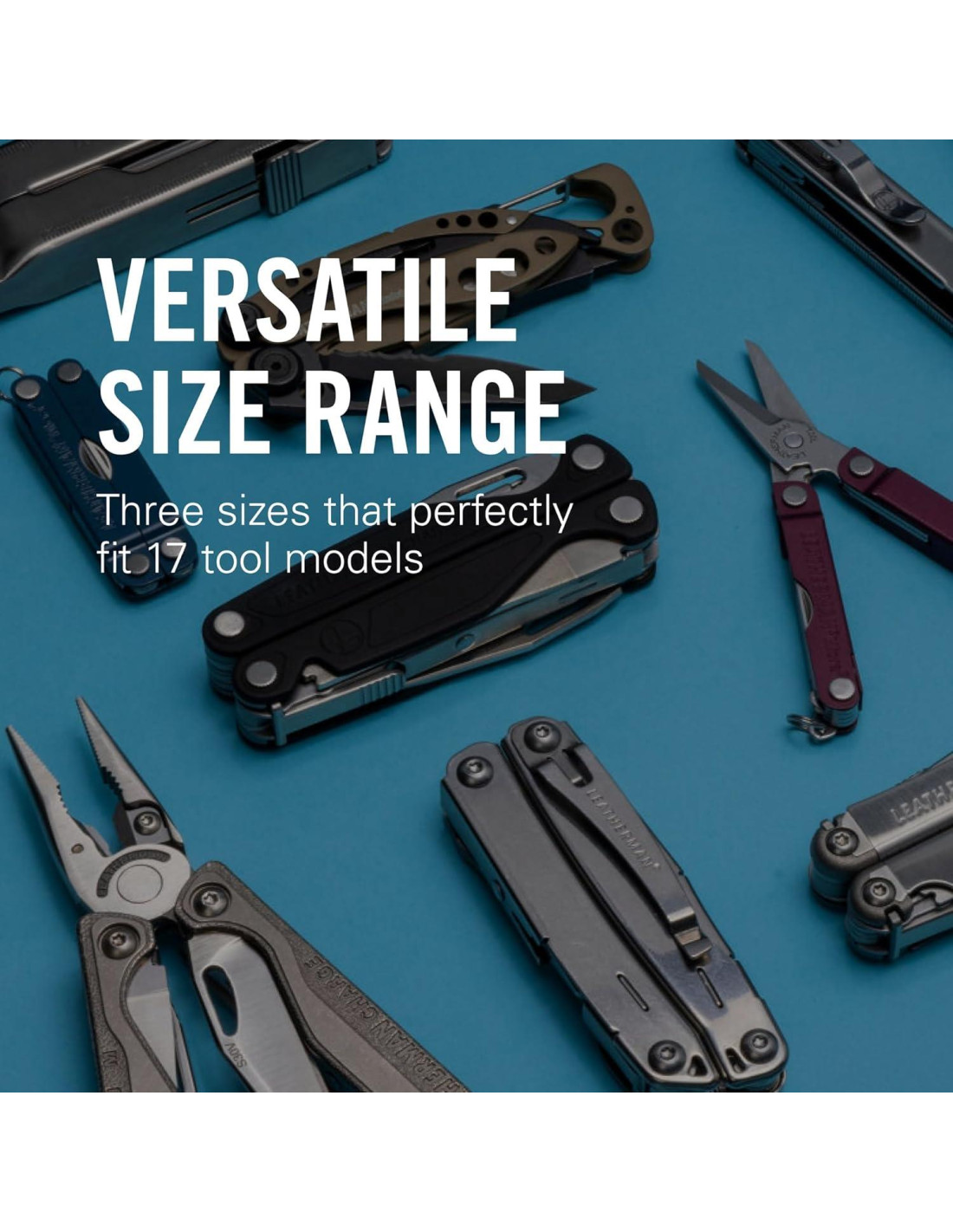 - Viene en tres tamaños: La pequeña acomoda herramientas de bolsillo como el Juice y Leap; la mediana acomoda herramientas de tamaño completo como Wave y Skeletool; la grande acomoda herramientas de uso pesado como Surge y Super Tool.