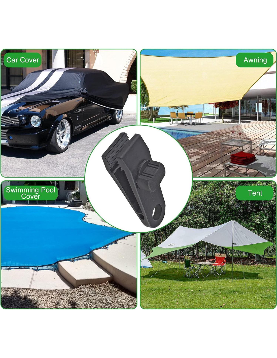 - Gancho de clip multifuncional: Los abrazaderas de tienda están diseñadas para versatilidad. Son adecuadas para sostener tiendas de campaña al aire libre, toldos, fundas de piscina, fundas de bicicleta, caravanas, toldos, fundas de barco, cubiertas temporales o cualquier tela que requiera puntos de soporte adicionales.