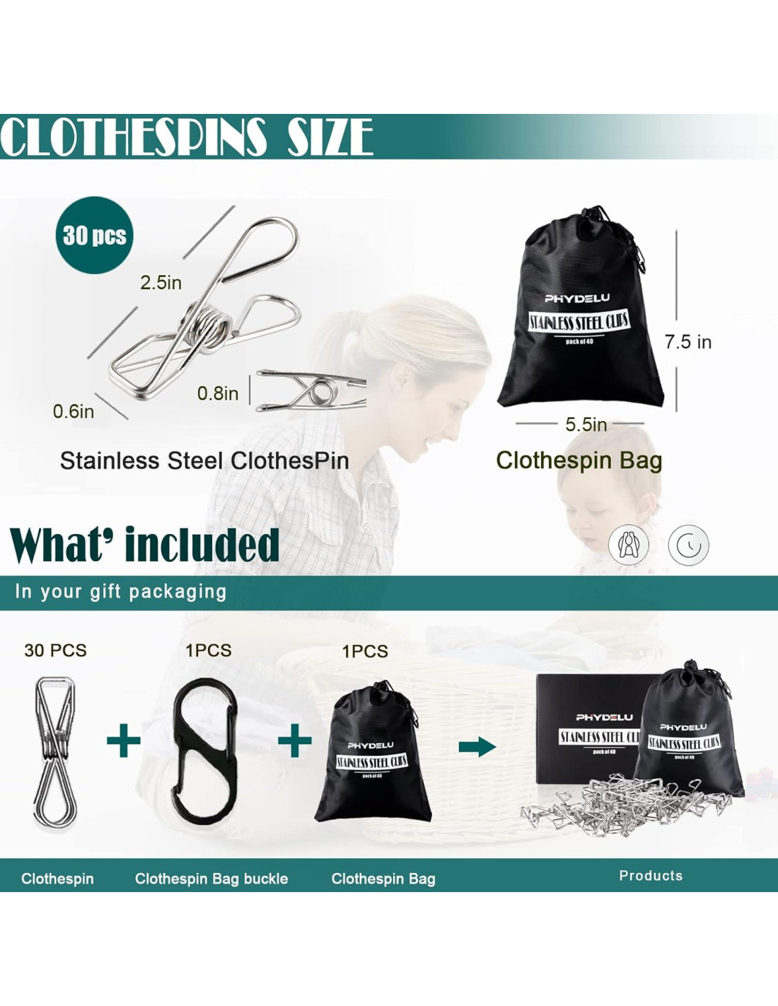 - [Productos Incluidos] 30 Pinzas para Ropa, 1 bolsa para pinzas, 1 hebilla para bolsa de clips. Pinzas hechas de acero inoxidable 304, resistentes y duraderas. Bolsa de pinzas hecha de tela oxford negra, robusta e irrompible, conveniente para almacenar pinzas y secar ropa.