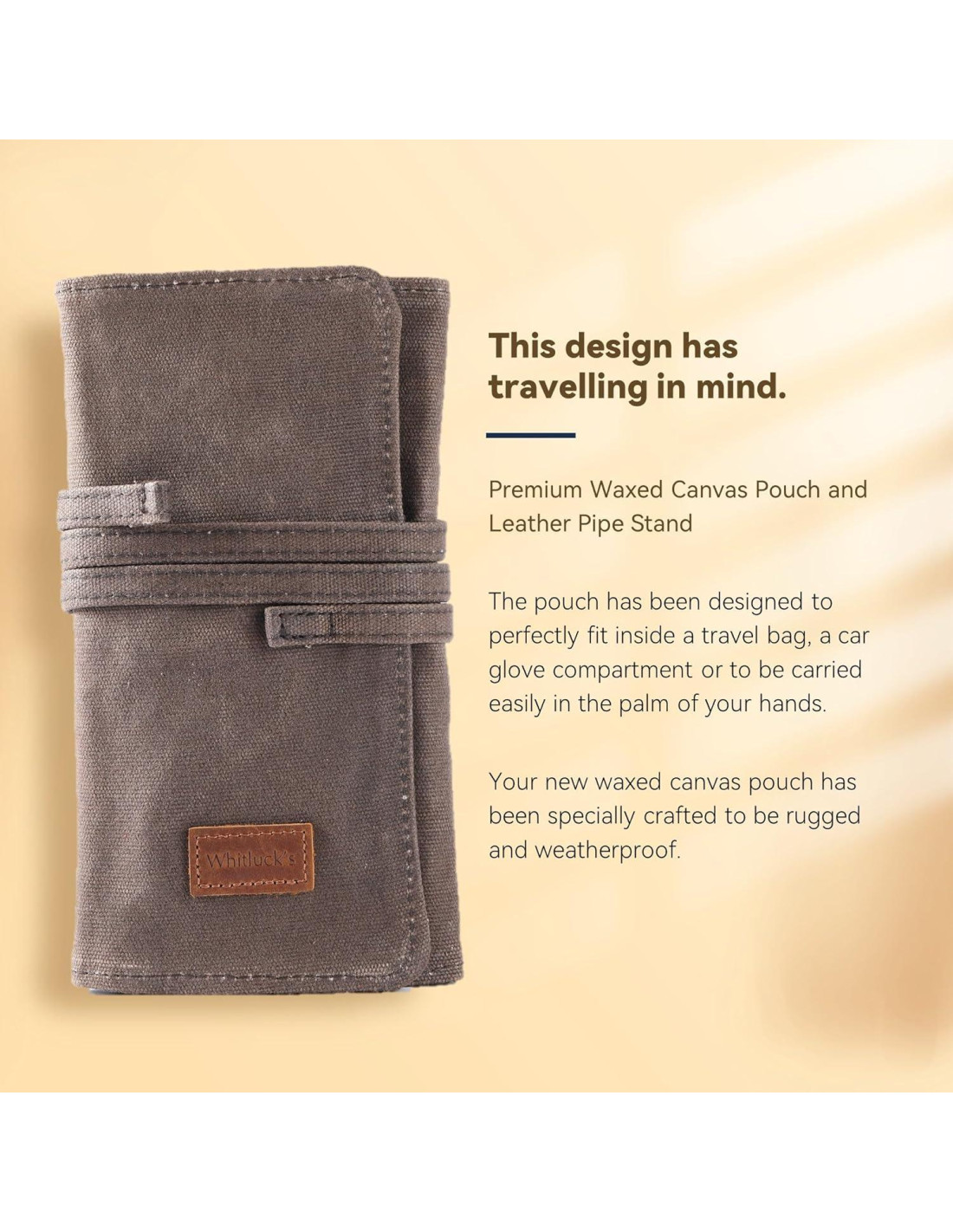 Whitluck's se enorgullece de presentar su bolsa de pipa de lona encerada de primera calidad y soporte de pipa de cuero. Con un diseño inspirado en esos primeros marineros, tu nueva bolsa de pipa de lona encerada ha sido especialmente diseñada para ser resistente y a prueba de clima. Nuestro diseño tiene en mente el viaje. Se adapta fácilmente a una bolsa de tamaño regular y, una vez completamente desplegada, proporciona una plataforma ideal para empacar tu pipa mientras estás en movimiento. Encontrarás que la bolsa ha sido diseñada para encajar perfectamente dentro de una bolsa de viaje, un compartimento de guantes de automóvil o para ser llevada fácilmente en la palma de tu mano. La bolsa también tiene mucho espacio para acomodar una bolsa de tabaco estándar, accesorios, como un prensador, limpiapipas, filtros y tu encendedor, y se adapta cómodamente hasta dos pipas. Nuestra guía electrónica inteligente te ayudará a limpiar y cuidar tu bolsa de pipa de lona encerada. ¿Tienes alguna pregunta al respecto? No dudes en hacérnoslo saber en cualquier momento. Nos enorgullecemos de nuestro rollo de pipa. Todas las fotos, videos y libros electrónicos están protegidos por derechos de autor. El diseño de nuestra bolsa de pipa de lona encerada está protegido por patente.