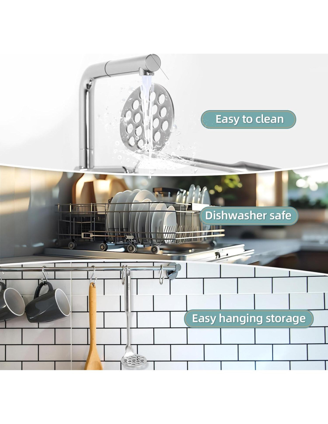 - FÁCIL DE USAR Y FÁCIL DE LIMPIAR; Obtienes más agarre y control, lo que facilita y acelera la preparación de alimentos aplastados. Puedes usar fácilmente una espátula de goma para raspar tu comida aplastada de la parte superior sin desperdicio. Acero inoxidable sin costuras, fácil de mantener limpio y apto para lavavajillas.