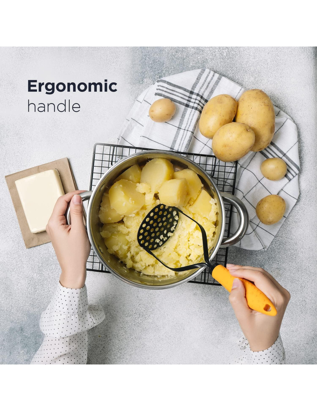 - HAZ QUE APLASTAR SEA FÁCIL - Aplastar patatas no debería doler tu mano, ni debería ser difícil. Queremos hacer tu vida en la cocina lo más sencilla posible. Nuestro prensador de patatas con su cómodo mango de goma hace que aplastar sea fácil.
