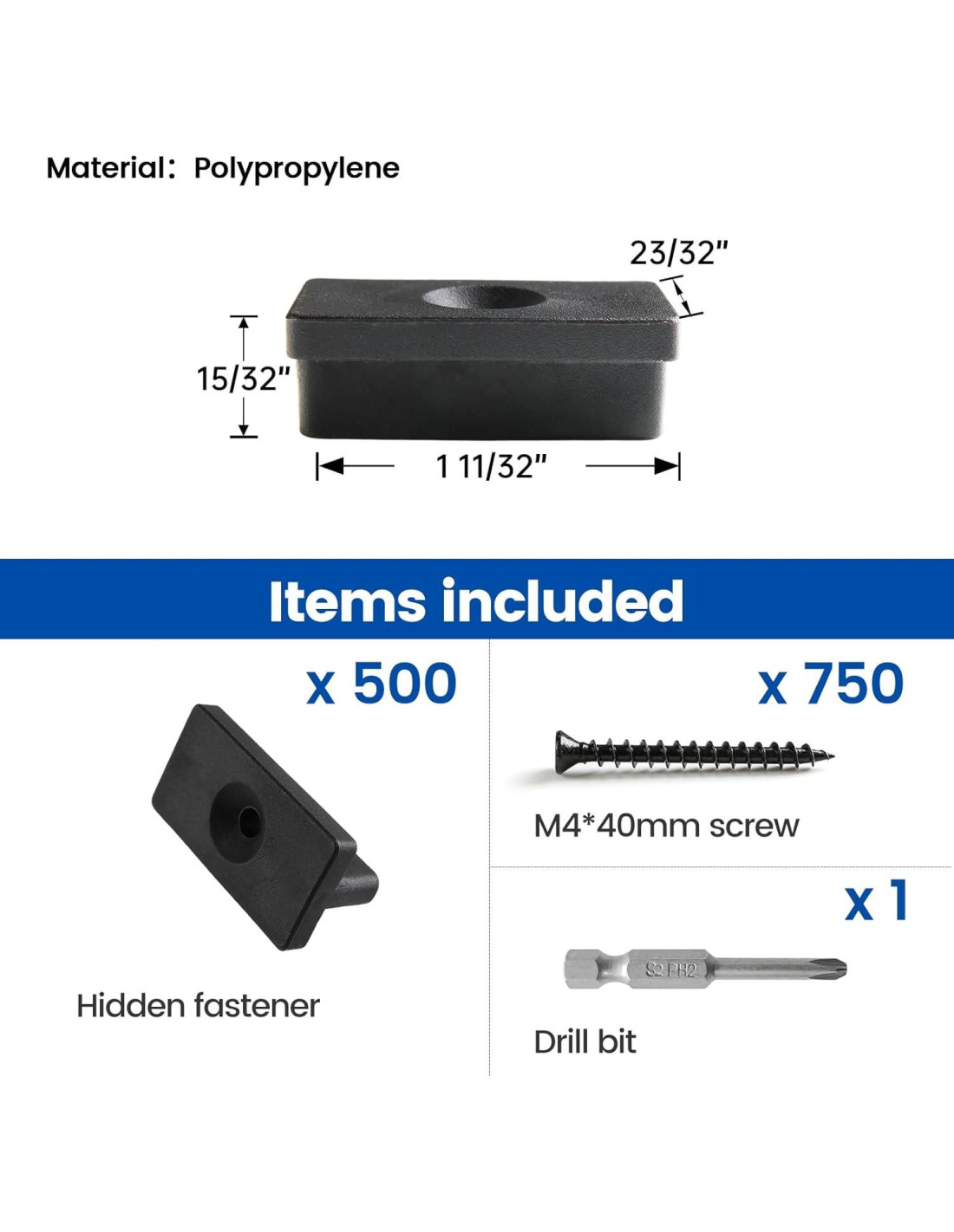 - Contenido: Con este paquete, recibirás un generoso suministro de 500 sujetadores ocultos premium completos con 750 tornillos, junto con 1 broca. Este conjunto integral está diseñado para cubrir una impresionante instalación de deck de 200-250 pies cuadrados (18.6-23.2 m). Muzata ofrece muchas opciones para tus diferentes áreas de deck. Para información detallada, consulta la tabla.