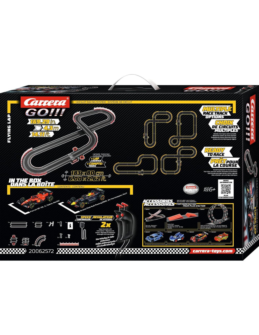 Carrera GO!!! Set de Coches de Slot Vuelta Voladora - Número de Artículo 20062572 Arranca tus motores y prepárate para experimentar la emoción de las carreras de coches de slot con la pista de carreras Carrera GO!!! Vuelta Voladora! Las carreras de coches de slot te traen la apariencia, sensación y emoción de conducir un coche de carreras real, pero tú estás al mando detrás del volante! Pronto tu corazón latirá rápido mientras aceleras por las rectas o derrapas alrededor de una curva cerrada para apretar el primer lugar y reclamar la bandera a cuadros antes que tu competencia! Toda esta acción se puede disfrutar en la comodidad de tu hogar. La pista de coches de slot Carrera GO!!! Vuelta Voladora establece el escenario para un duelo rápido entre un Ferrari SF-23 y un Red Bull Racing RB19. Con estos dos coches de carreras populares, tú como conductor tienes la clave para saber quién obtiene la bandera a cuadros en esta emocionante carrera cara a cara! Corre en un circuito que se extiende por más de 14 pies (4,27 m) y presenta rectas y curvas que proporcionarán acción emocionante en toda la pista. Solo el conductor con las mejores habilidades puede dominar la pista y reclamar la victoria al final! Horas de acción y diversión están garantizadas. Con una variedad de accesorios disponibles, conjuntos de expansión de pista y una amplia selección de coches adicionales, este completo sistema de pista de coches de slot se puede expandir y modificar para posibilidades infinitas y más carreras increíbles. El conjunto completo de coches de slot incluye un transformador, pista de conexión, 2 controladores de velocidad, 2 coches a escala 1:43, contador de vueltas, rectas, curvas y soportes. Los dos coches incluidos en este conjunto son un Ferrari SF-23, "C. Sainz, No.55" y un Red Bull Racing RB19, "M. Verstappen, No.1".