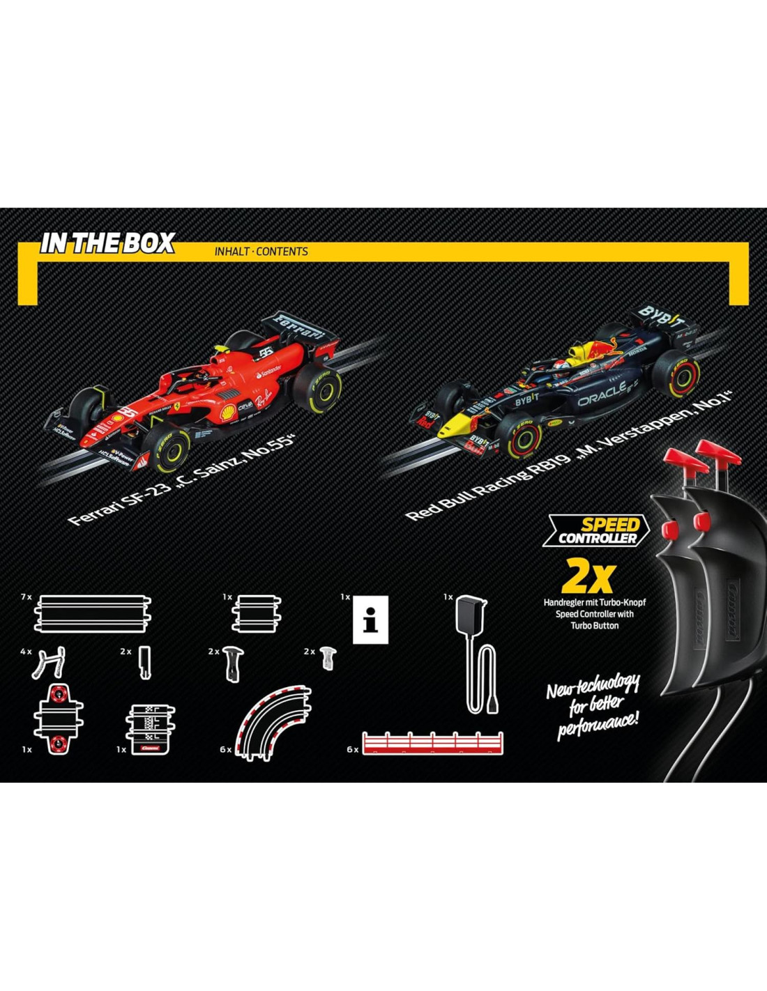 - Coches de slot incluidos: Ferrari SF-23, "C. Sainz, No.55" y Red Bull Racing RB19, "M. Verstappen, No.1"