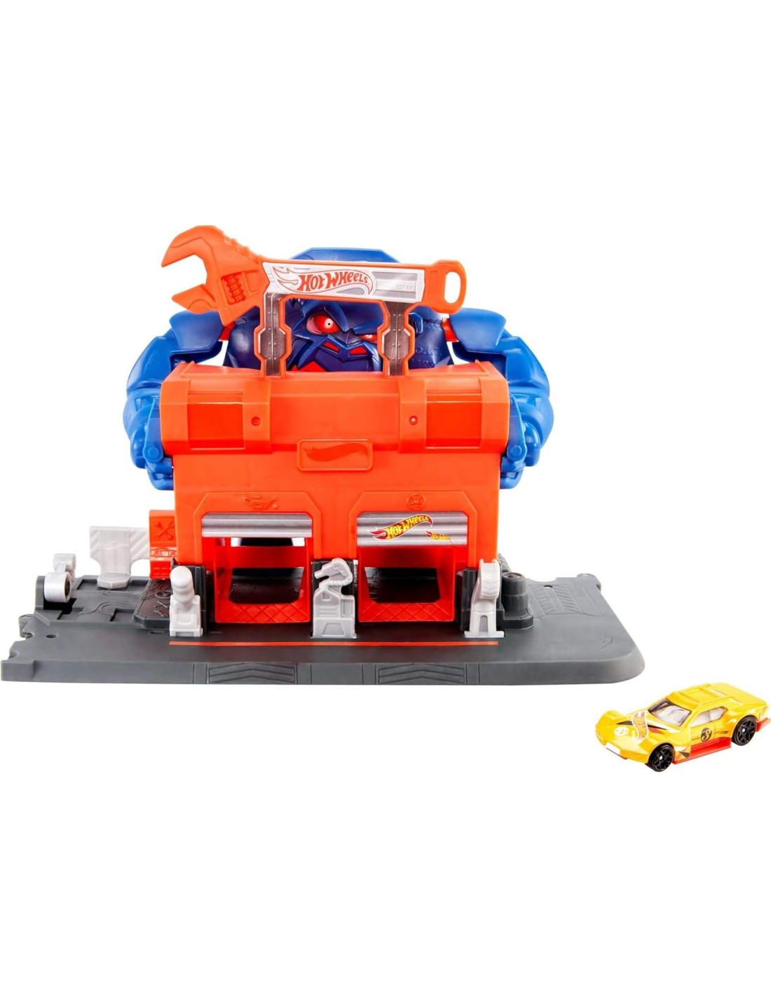 Cada conjunto emocionante proporciona juego de narración mientras los niños juegan al héroe y utilizan sus coches Hot Wheels para luchar y hacer acrobacias para salvar el día. ¡Lucha contra el caimán escondido en el Conjunto de Ataque del Garaje del Caimán, derrota al murciélago escondido en la casa abandonada y no te dejes atrapar por la araña colgante en el parque! En el muelle tendrás que escapar de los tentáculos del pulpo gigante y tener cuidado con la picadura del escorpión gigante en el restaurante de autoservicio. Cada uno de estos 5 conjuntos de Hot Wheels City se conecta a otros conjuntos de Hot Wheels City y también es compatible con la pista naranja. Incluye un vehículo Hot Wheels.