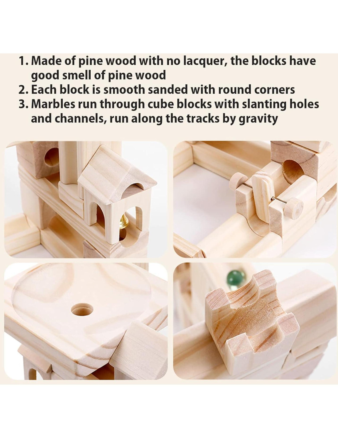 - Juguete seguro y gran elección para niños: El set de juego de pista de canicas Onshine está hecho de madera de pino natural, todos los bloques están pulidos suavemente con bordes redondeados, y no están pintados, seguros para que los niños jueguen. Gran elección para niños y niñas de 4 años en adelante.