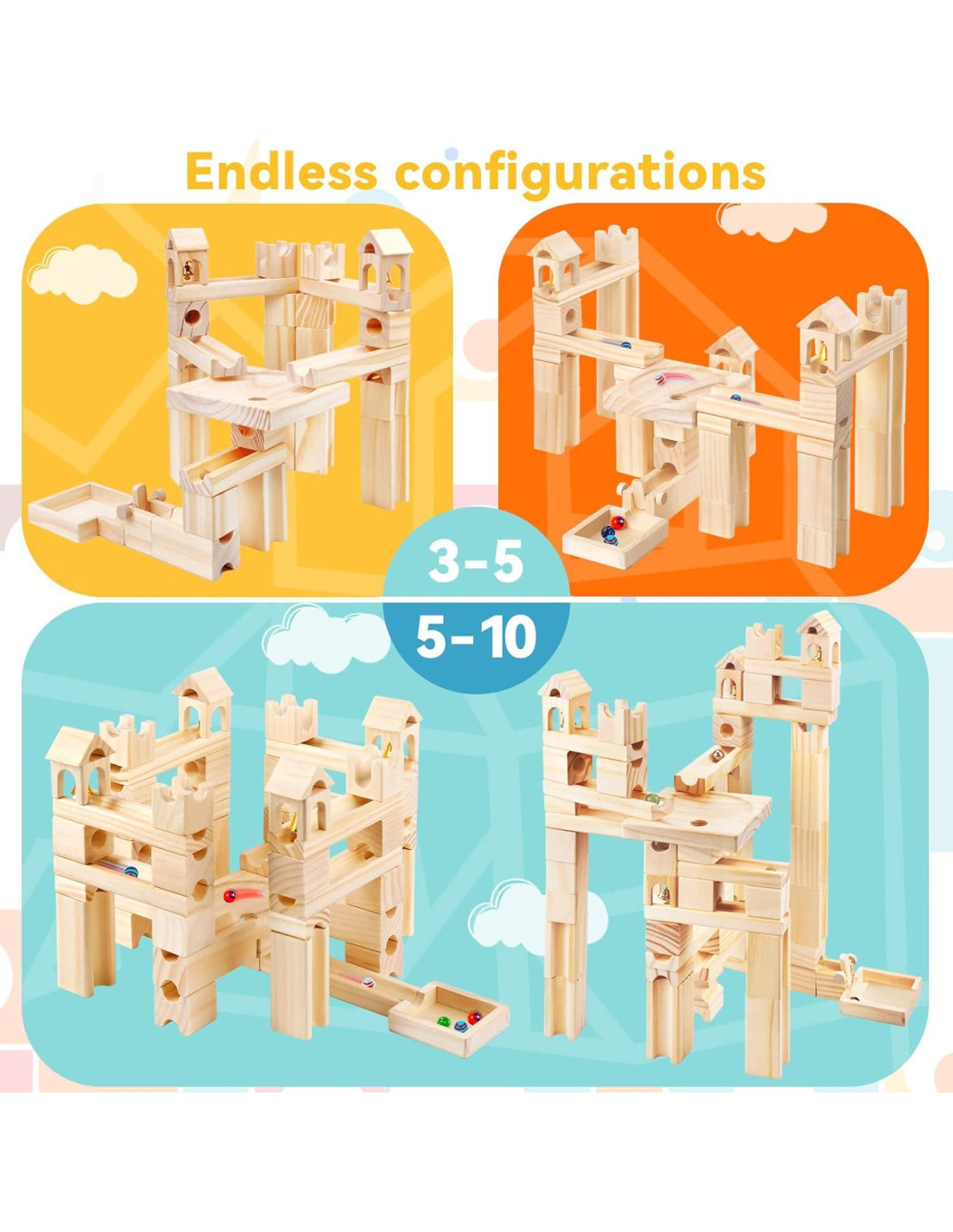 - Juego de bloques de pista de canicas de madera de 80 piezas: El set incluye una buena variedad de 70 bloques de madera y pistas, 10 canicas de vidrio y un manual básico de construcción.