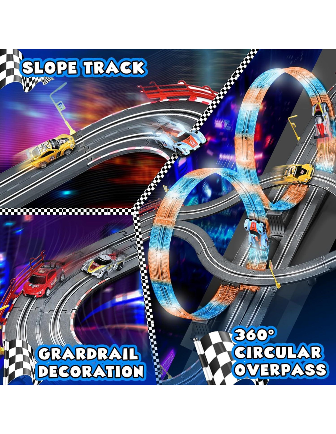 - Pistas de carreras duales emocionantes: Nuestros conjuntos de pista de carreras de coches de ranura simulan una variedad de pistas de carreras, incluyendo pistas rectas simples, pistas curvas, pistas circulares escalonadas de 360 grados y emocionantes pistas de paso de doble capa, y la función de conteo automático de vueltas también brinda la experiencia de carrera más genial a los corredores. Diseñamos dos diseños de pista distintos para ofrecer múltiples rutas de carrera, permitiendo a los niños personalizar sus propias aventuras de carrera.