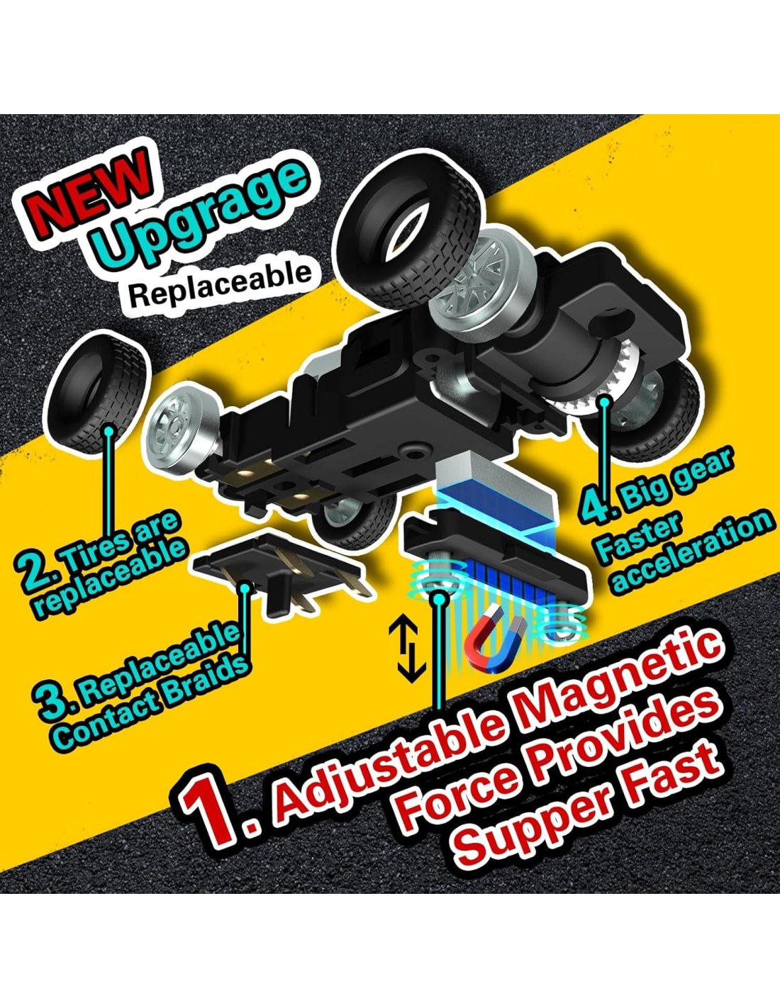 - Pistas Extra Largas para Fácil Instalación: La pista de coches de ranura mide 8.2 pies (2.5 metros) de largo, lo que es más largo que la mayoría de otros productos, y tiene un mejor sistema para fijarse en su lugar y ser fácil de ensamblar. Para mantener el coche en la pista mejor, hemos mejorado el magnetismo, pero también es importante controlar la velocidad, recuerda reducir la velocidad al girar. Además, también preparamos cepillos extra en la parte inferior del coche para que los reemplaces en cualquier momento.
