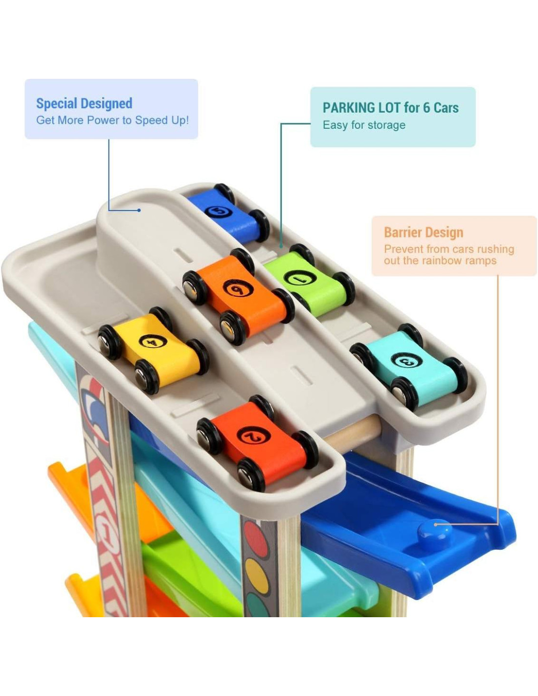 - Pista de Coche: A diferencia de los coches de rampa ordinarios, los juguetes de coches incluyen 6 rampas de coche, 1 garaje de juguete, 6 coches de carreras de rampa de madera y 3 puentes extra. Los niños pueden recoger los coches en el aparcamiento superior por sí mismos, mejorando el sentido de almacenamiento del bebé y evitando que los coches se pierdan