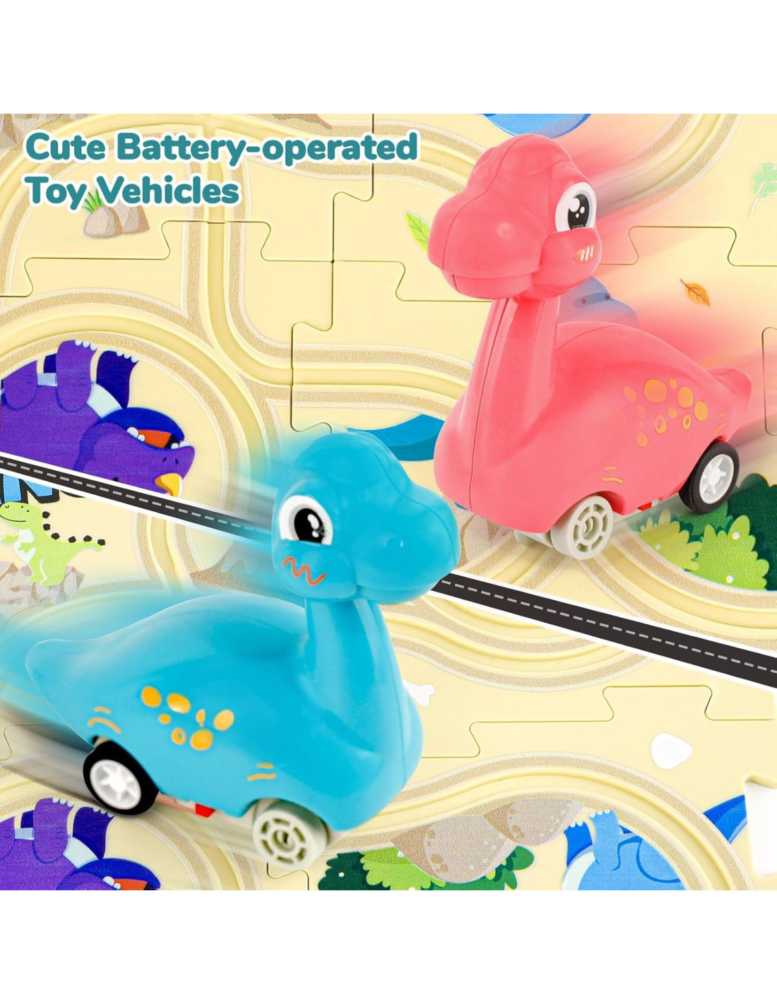 - Juego de Pista de Autos de Dinosaurios: Este conjunto de juguetes de rompecabezas incluye 12 rompecabezas, 2 autos de juguete de dinosaurio (se requiere 1 batería AAA, no incluida); Los niños necesitan ensamblar las piezas del rompecabezas de una manera determinada para permitir que los autos sigan la pista